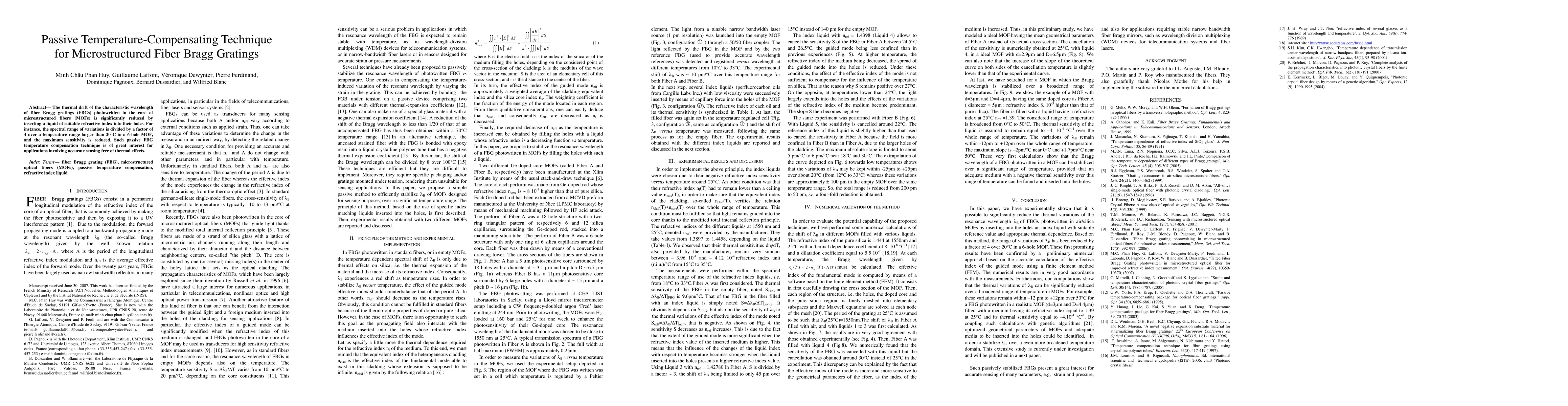This paper presents a passive temperature-compensating technique for fiber Bragg gratings (FBGs) in microstructured fibers (MOFs) by filling their holes with a liquid of suitable refractive index, significantly reducing thermal drift and sensitivity. This method is crucial for precise sensing applications unaffected by thermal variations.