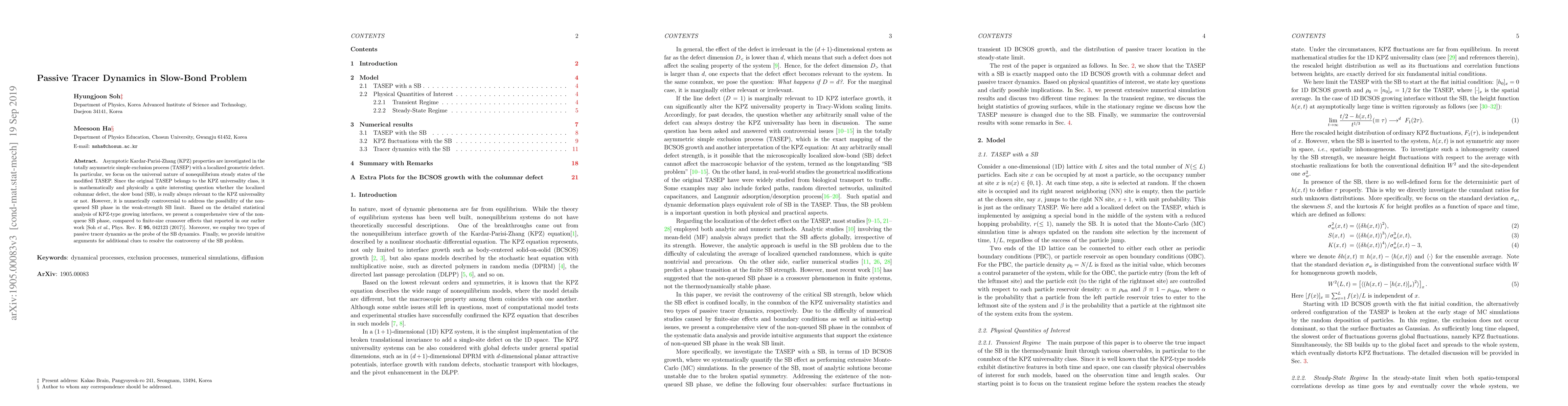 Asymptotic Kardar-Parisi-Zhang (KPZ) properties are investigated in the totally asymmetric simple exclusion process (TASEP) with a localized geometric defect. In particular, we focus on the universal nature of nonequilibrium steady states of the modified TASEP. Since the original TASEP belongs to the KPZ universality class, it is mathematically and physically a quite interesting question whether the localized columnar defect, the slow bond (SB), is really always relevant to the KPZ universality or not. However, it is numerically controversial to address the possibility of the non-queued SB phase in the weak-strength SB limit. Based on the detailed statistical analysis of KPZ-type growing interfaces, we present a comprehensive view of the non-queue SB phase, compared to finite-size crossover effects that reported in our earlier work [Soh {\it et al.}, Phys. Rev. E {\bf 95}, 042123 (2017)]. Moreover, we employ two types of passive tracer dynamics as the probe of the SB dynamics. Finally, we provide intuitive arguments for additional clues to resolve the controversy of the SB problem.