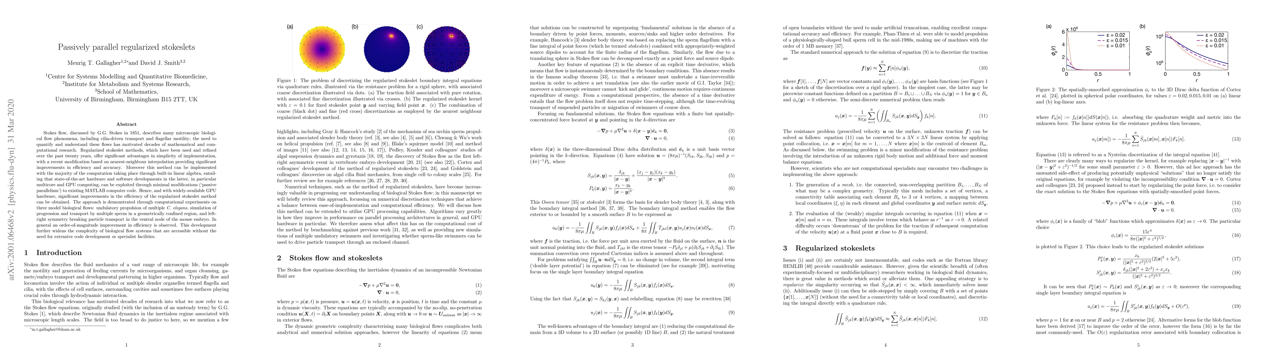 This paper introduces a passively parallel regularized stokeslet method for efficiently simulating Stokes flow, demonstrating significant improvements in computational efficiency through GPU utilization. The method is applied to model biological flows, achieving an order-of-magnitude speedup and broadening the range of complex biological systems that can be studied.