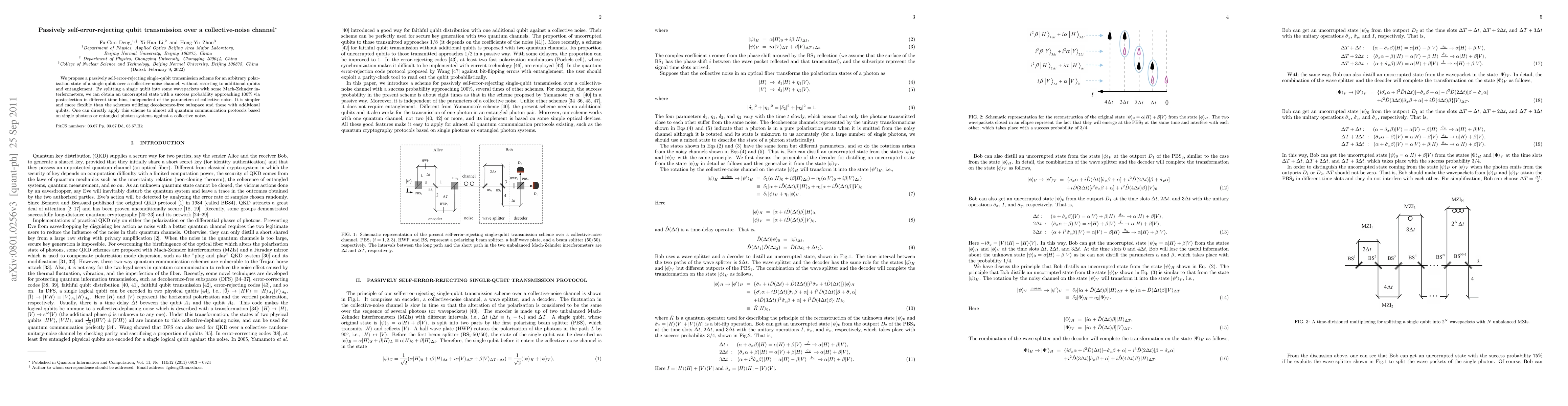 We propose a passively self-error-rejecting single-qubit transmission scheme for an arbitrary polarization state of a single qubit over a collective-noise channel, without resorting to additional qubits and entanglement. By splitting a single qubit into some wavepackets with some Mach-Zehnder interferometers, we can obtain an uncorrupted state with a success probability approaching 100% via postselection in different time bins, independent of the parameters of collective noise. It is simpler and more flexible than the schemes utilizing decoherence-free subspace and those with additional qubits. One can directly apply this scheme to almost all quantum communication protocols based on single photons or entangled photon systems against a collective noise.
