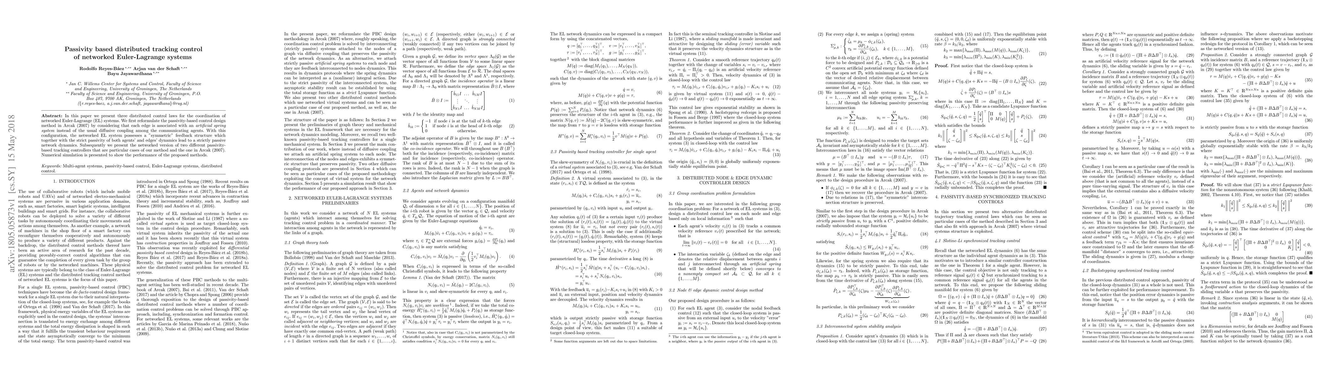 In this paper we present three distributed control laws for the coordination of networked Euler-Lagrange (EL) systems. We first reformulate the passivity-based control design method in \cite{Arcak} by considering that each edge is associated with an \emph{artificial spring system} instead of the usual diffusive coupling among the communicating agents. With this configuration, the networked EL system possesses a "symmetric" feedback structure which together with the strict passivity of both agents' and edges' dynamics lead to a strictly passive network dynamics. Subsequently we present the networked version of two different passivity-based tracking controllers %local controllers that are particular cases of our method and the one in \cite{Arcak}. Numerical simulation is presented to show the performance of the proposed methods.