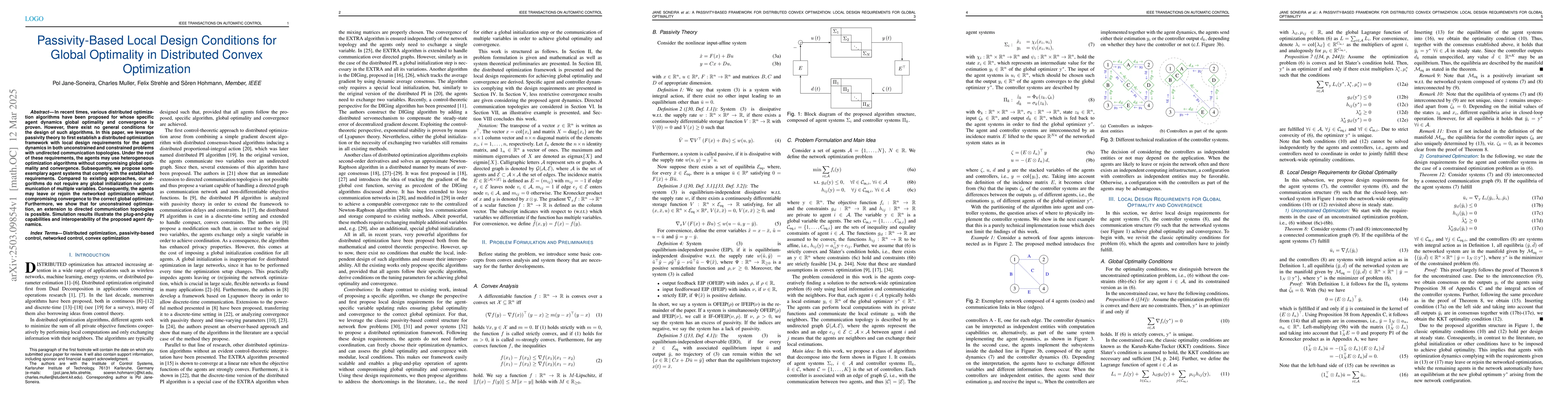 The paper establishes a distributed optimization framework using passivity theory, defining local design requirements for agent dynamics in unconstrained and constrained problems with undirected communication topologies.