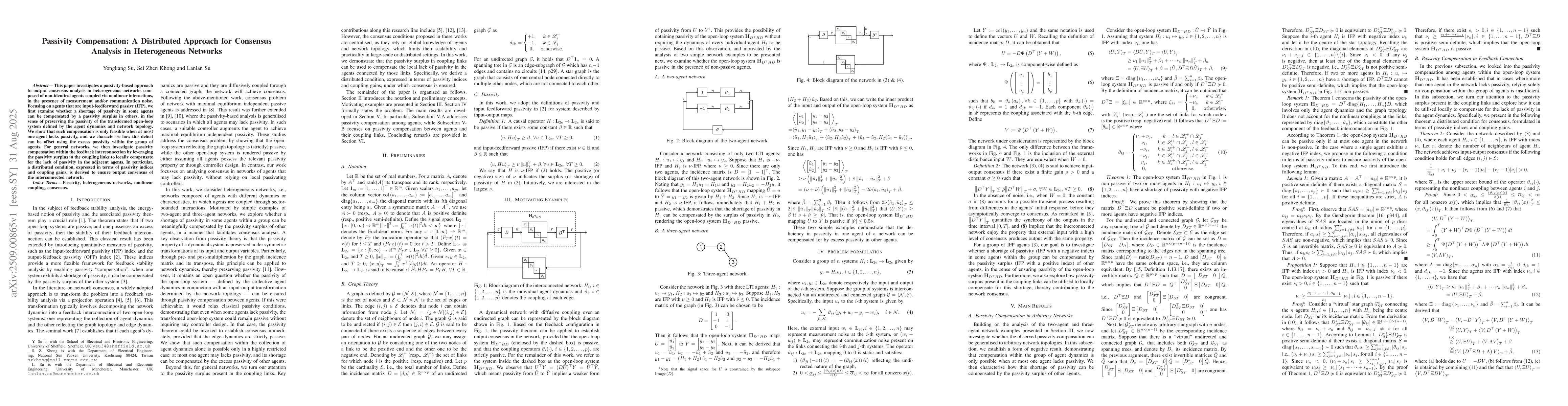 This paper investigates a passivity-based approach to output consensus analysis in heterogeneous networks composed of non-identical agents coupled via nonlinear interactions, in the presence of measurement and/or communication noise. Focusing on agents that are input-feedforward passive (IFP), we first examine whether a shortage of passivity in some agents can be compensated by a passivity surplus in others, in the sense of preserving the passivity of the transformed open-loop system defined by the agent dynamics and network topology. We show that such compensation is only feasible when at most one agent lacks passivity, and we characterise how this deficit can be offset using the excess passivity within the group of agents. For general networks, we then investigate passivity compensation within the feedback interconnection by leveraging the passivity surplus in the coupling links to locally compensate for the lack of passivity in the adjacent agents. In particular, a distributed condition, expressed in terms of passivity indices and coupling gains, is derived to ensure output consensus of the interconnected network.