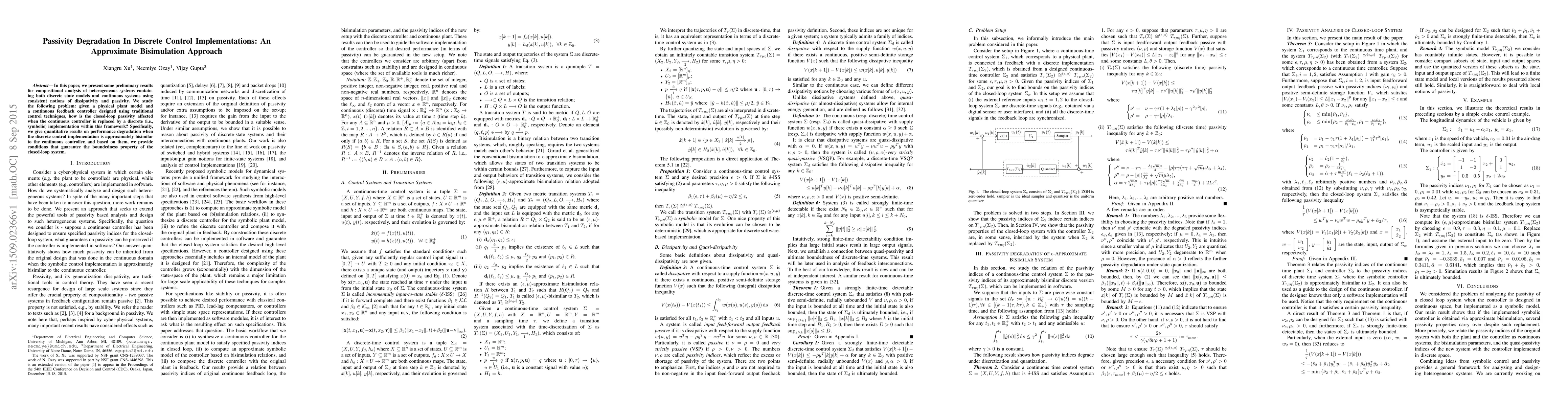 In this paper, we present some preliminary results for compositional analysis of heterogeneous systems containing both discrete state models and continuous systems using consistent notions of dissipativity and passivity. We study the following problem: given a physical plant model and a continuous feedback controller designed using traditional control techniques, how is the closed-loop passivity affected when the continuous controller is replaced by a discrete (i.e., symbolic) implementation within this framework? Specifically, we give quantitative results on performance degradation when the discrete control implementation is approximately bisimilar to the continuous controller, and based on them, we provide conditions that guarantee the boundedness property of the closed-loop system.