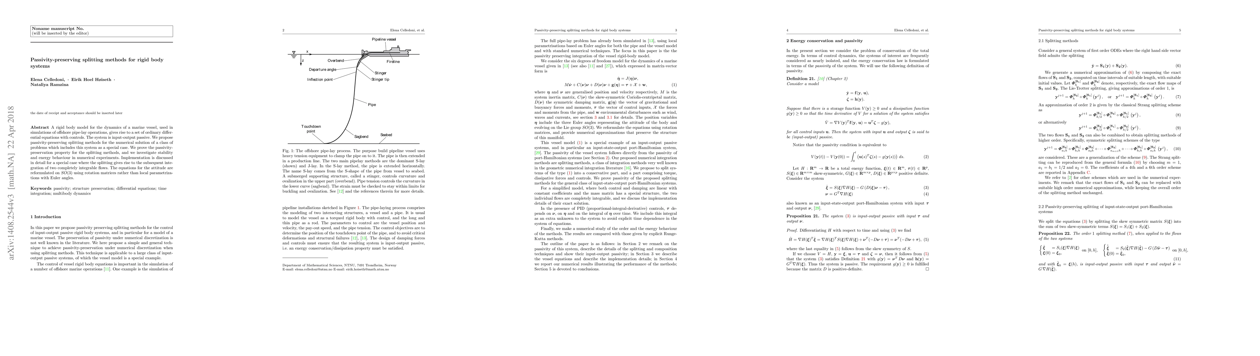 A rigid body model for the dynamics of a marine vessel, used in simulations of offshore pipe-lay operations, gives rise to a set of ordinary differential equations with controls. The system is input-output passive. We propose passivity-preserving splitting methods for the numerical solution of a class of problems which includes this system as a special case. We prove the passivity-preservation property for the splitting methods, and we investigate stability and energy behaviour in numerical experiments. Implementation is discussed in detail for a special case where the splitting gives rise to the subsequent integration of two completely integrable flows. The equations for the attitude are reformulated on $SO(3)$ using rotation matrices rather than local parametrizations with Euler angles.