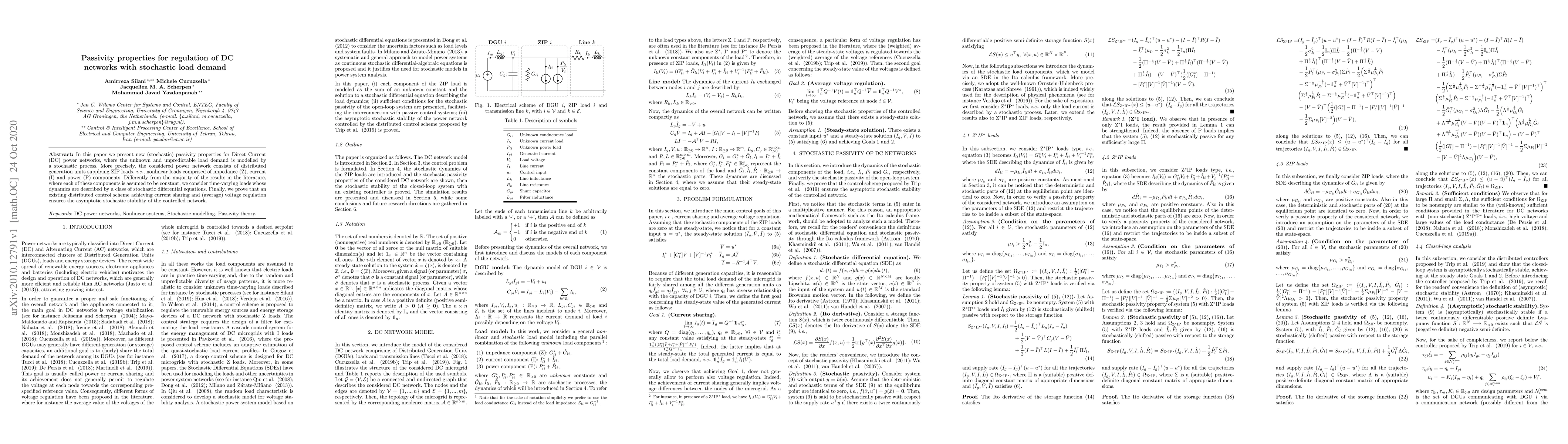 In this paper we present new (stochastic) passivity properties for Direct Current (DC) power networks, where the unknown and unpredictable load demand is modelled by a stochastic process. More precisely, the considered power network consists of distributed generation units supplying ZIP loads, i.e., nonlinear loads comprised of impedance (Z), current (I) and power (P) components. Differently from the majority of the results in the literature, where each of these components is assumed to be constant, we consider time-varying loads whose dynamics are described by a class of stochastic differential equations. Finally, we prove that an existing distributed control scheme achieving current sharing and (average) voltage regulation ensures the asymptotic stochastic stability of the controlled network.
