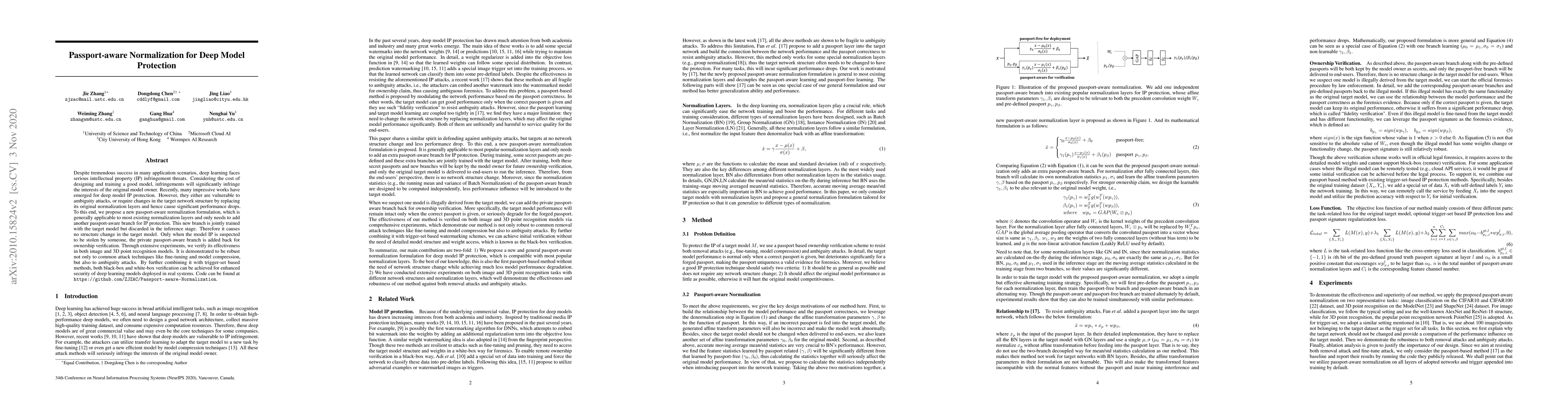 This paper proposes a passport-aware normalization method to protect deep learning models from intellectual property infringement. The method adds a verification branch that is trained jointly but discarded during inference, ensuring no structural changes to the original model while providing robust protection against various attack techniques and ownership verification.