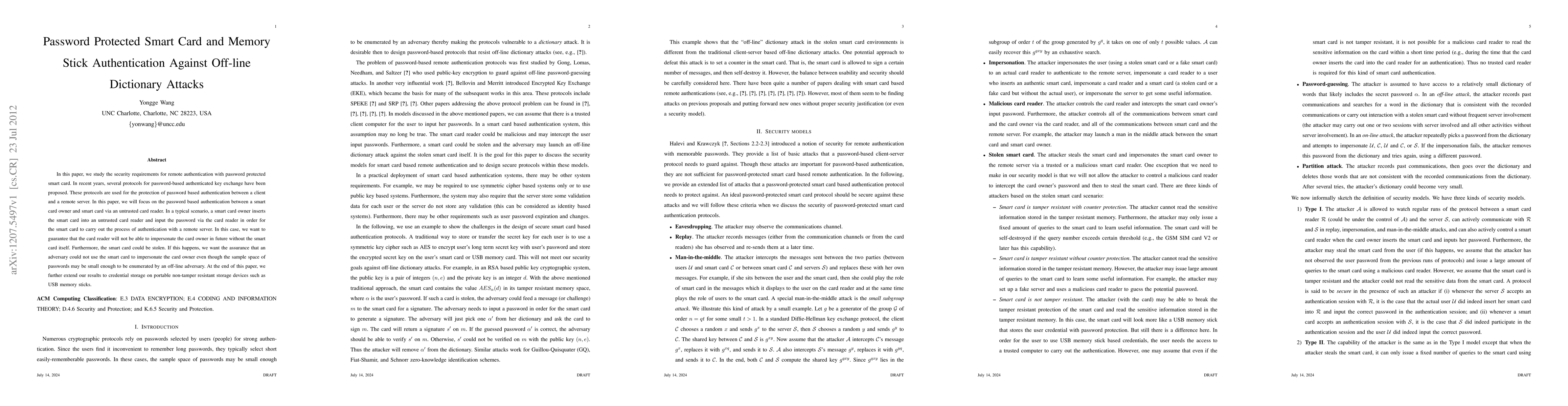 This paper investigates security protocols for password-based authentication between a smart card owner and a smart card via an untrusted card reader, focusing on resisting off-line dictionary attacks. It extends the findings to secure credential storage on portable devices like USB memory sticks.