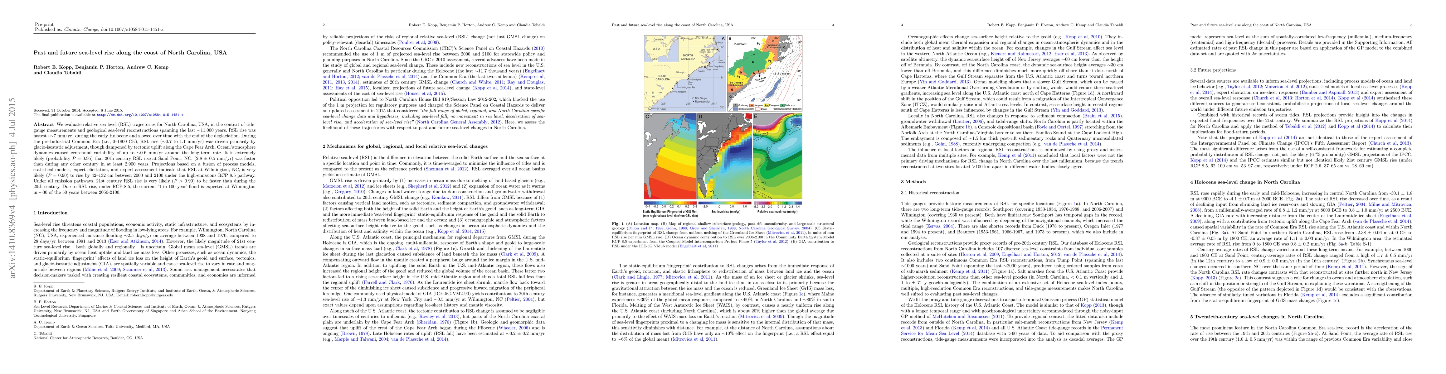 This study analyzes sea-level rise (RSL) along North Carolina's coast over the past 11,000 years, noting fastest rise during the early Holocene, and slower rates driven by glacio-isostatic adjustment and tectonic uplift historically. It projects a significant acceleration in 21st century RSL under high-emissions scenarios, predicting a substantial increase in flooding risks by mid-century.