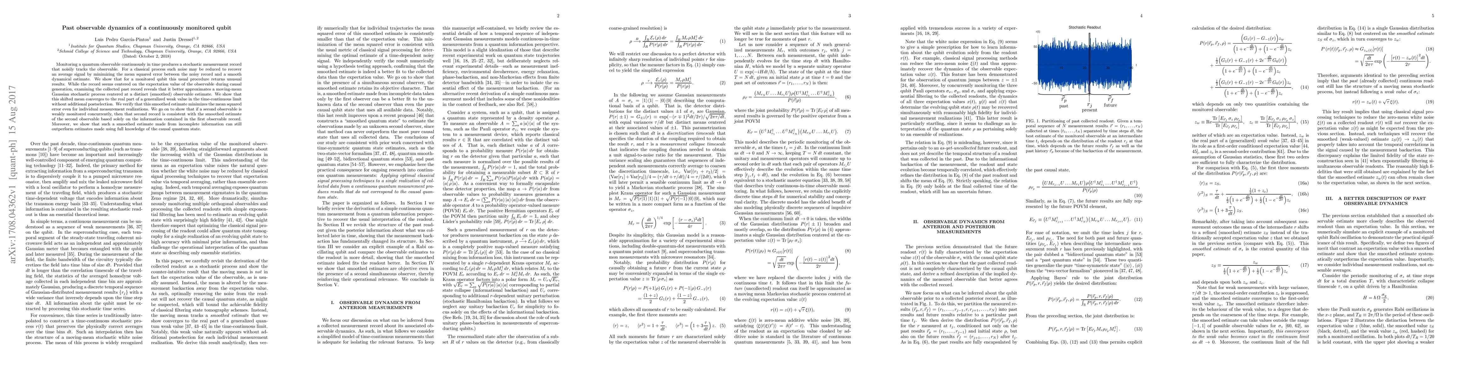 Monitoring a quantum observable continuously in time produces a stochastic measurement record that noisily tracks the observable. For a classical process such noise may be reduced to recover an average signal by minimizing the mean squared error between the noisy record and a smooth dynamical estimate. We show that for a monitored qubit this usual procedure returns unusual results. While the record seems centered on the expectation value of the observable during causal generation, examining the collected past record reveals that it better approximates a moving-mean Gaussian stochastic process centered at a distinct (smoothed) observable estimate. We show that this shifted mean converges to the real part of a generalized weak value in the time-continuous limit without additional postselection. We verify that this smoothed estimate minimizes the mean squared error even for individual measurement realizations. We go on to show that if a second observable is weakly monitored concurrently, then that second record is consistent with the smoothed estimate of the second observable based solely on the information contained in the first observable record. Moreover, we show that such a smoothed estimate made from incomplete information can still outperform estimates made using full knowledge of the causal quantum state.