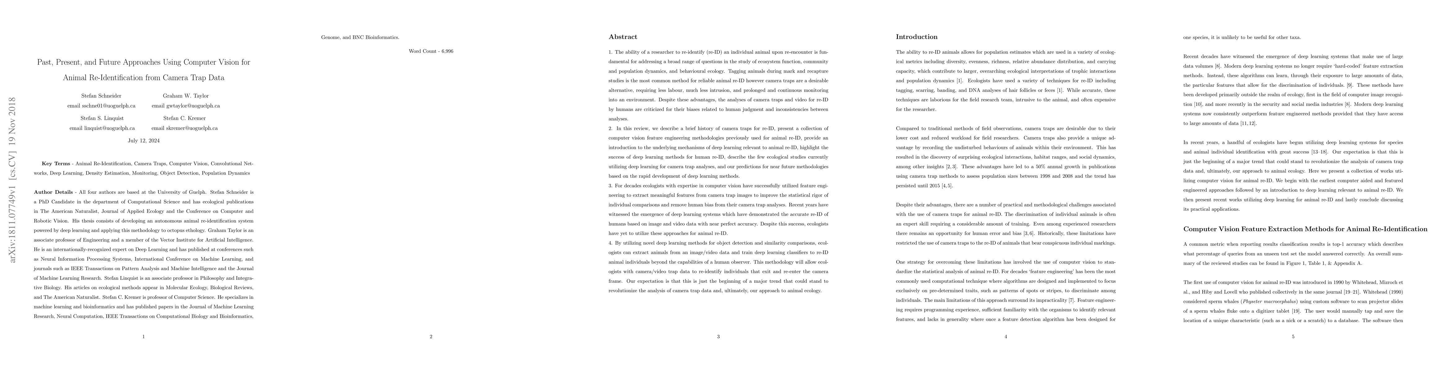 This paper reviews historical, current, and future approaches in using computer vision, especially deep learning, for animal re-identification from camera trap data, highlighting its potential to revolutionize ecological studies by automating the process and surpassing human observational capabilities.