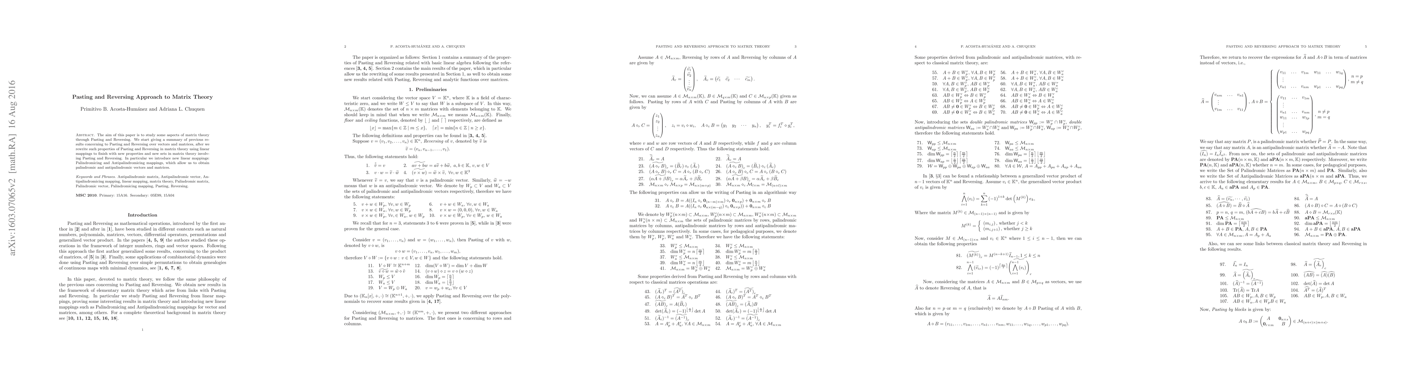 This paper explores matrix theory via Pasting and Reversing techniques, summarizing previous results and introducing new linear mappings—Palindromicing and Antipalindromicing—to generate palindromic and antipalindromic vectors and matrices.