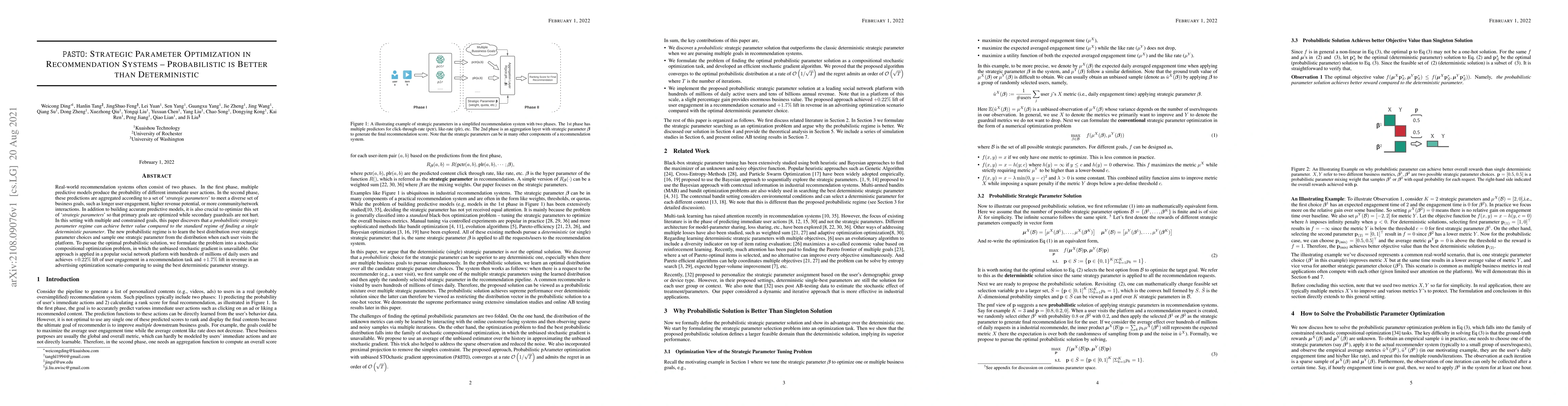 Real-world recommendation systems often consist of two phases. In the first phase, multiple predictive models produce the probability of different immediate user actions. In the second phase, these predictions are aggregated according to a set of 'strategic parameters' to meet a diverse set of business goals, such as longer user engagement, higher revenue potential, or more community/network interactions. In addition to building accurate predictive models, it is also crucial to optimize this set of 'strategic parameters' so that primary goals are optimized while secondary guardrails are not hurt. In this setting with multiple and constrained goals, this paper discovers that a probabilistic strategic parameter regime can achieve better value compared to the standard regime of finding a single deterministic parameter. The new probabilistic regime is to learn the best distribution over strategic parameter choices and sample one strategic parameter from the distribution when each user visits the platform. To pursue the optimal probabilistic solution, we formulate the problem into a stochastic compositional optimization problem, in which the unbiased stochastic gradient is unavailable. Our approach is applied in a popular social network platform with hundreds of millions of daily users and achieves +0.22% lift of user engagement in a recommendation task and +1.7% lift in revenue in an advertising optimization scenario comparing to using the best deterministic parameter strategy.
