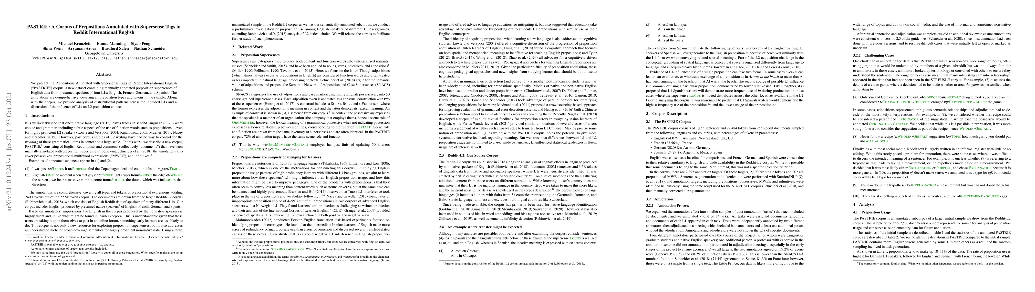 The PASTRIE corpus annotates prepositions in Reddit International English with supersense tags, detailing usage by speakers of English, French, German, and Spanish. It analyzes distributional patterns and the influence of native languages on second language preposition selection.