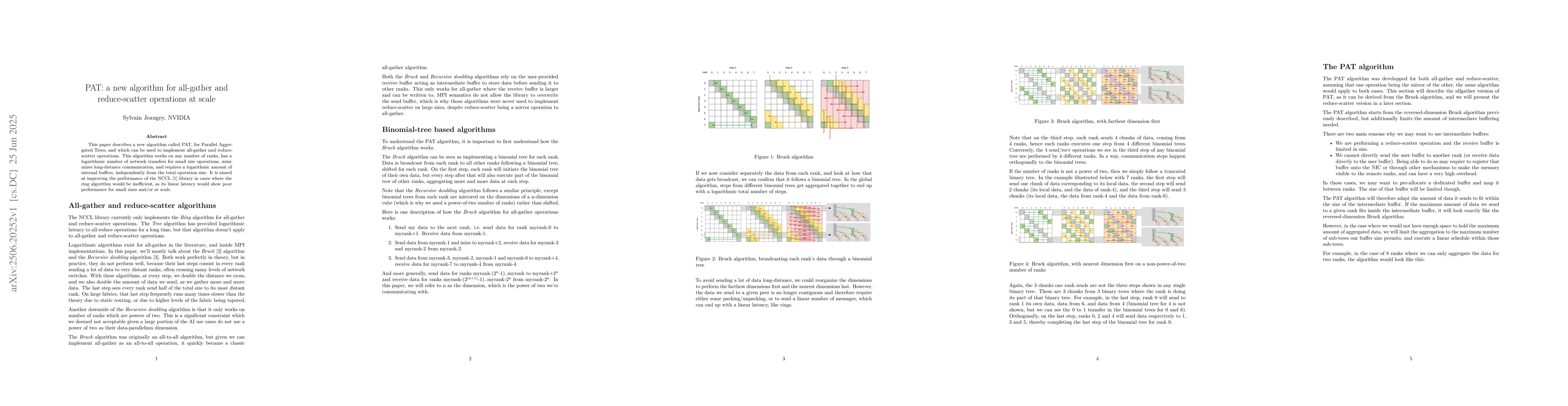 This paper describes a new algorithm called PAT, for Parallel Aggregated Trees, and which can be used to implement all-gather and reduce-scatter operations. This algorithm works on any number of ranks, has a logarithmic number of network transfers for small size operations, minimizes long-distance communication, and requires a logarithmic amount of internal buffers, independently from the total operation size. It is aimed at improving the performance of the NCCL library in cases where the ring algorithm would be inefficient, as its linear latency would show poor performance for small sizes and/or at scale.