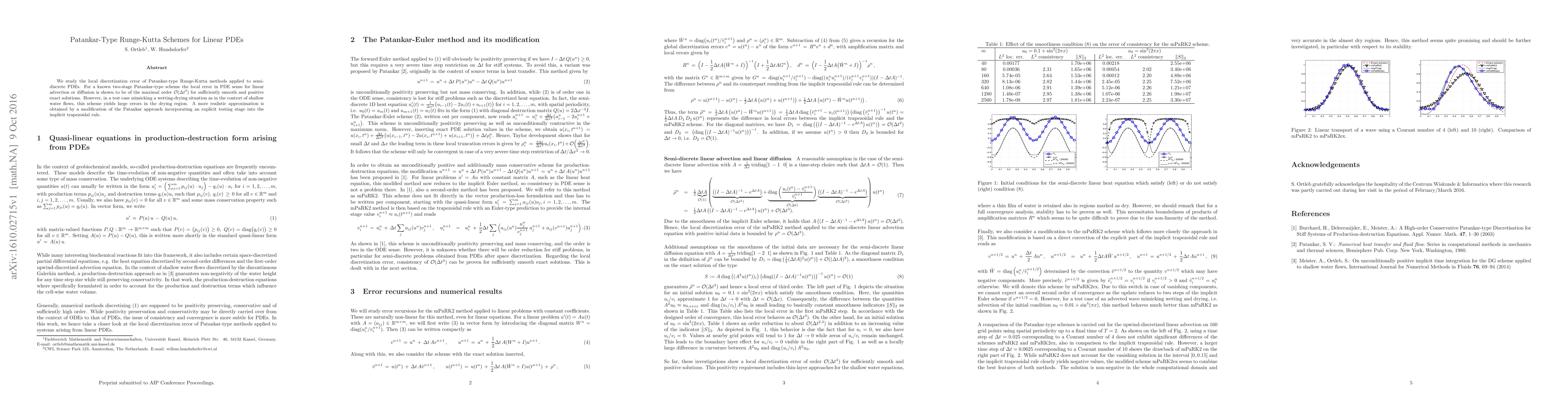 We study the local discretization error of Patankar-type Runge-Kutta methods applied to semi-discrete PDEs. For a known two-stage Patankar-type scheme the local error in PDE sense for linear advection or diffusion is shown to be of the maximal order ${\cal O}(\Delta t^3)$ for sufficiently smooth and positive exact solutions. However, in a test case mimicking a wetting-drying situation as in the context of shallow-water flows, this scheme yields large errors in the drying region. A more realistic approximation is obtained by a modification of the Patankar approach incorporating an explicit testing stage into the implicit trapezoidal rule.