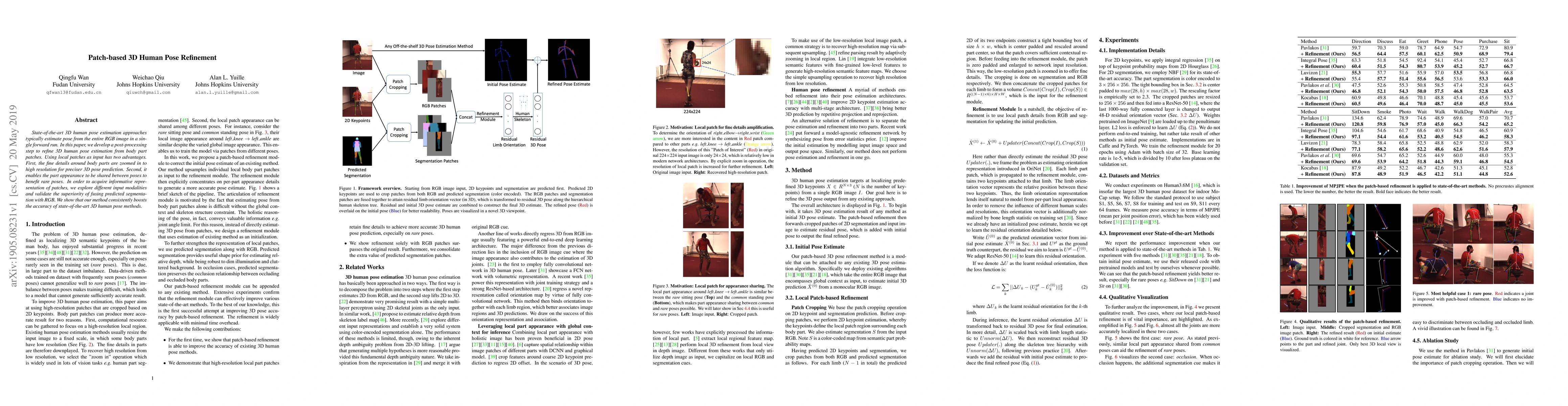 The paper introduces a patch-based 3D human pose refinement method that utilizes local body part patches from RGB images, zoomed into high resolution for precise prediction. It also incorporates segmentation prediction with RGB for improved performance, particularly for rare poses and occlusions.