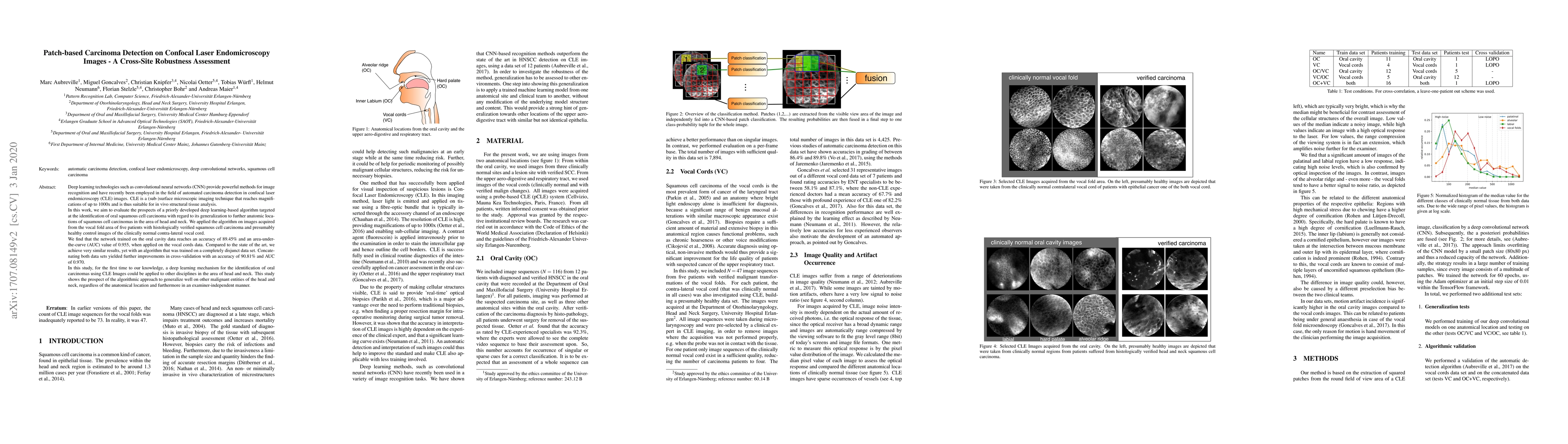 Deep learning technologies such as convolutional neural networks (CNN) provide powerful methods for image recognition and have recently been employed in the field of automated carcinoma detection in confocal laser endomicroscopy (CLE) images. CLE is a (sub-)surface microscopic imaging technique that reaches magnifications of up to 1000x and is thus suitable for in vivo structural tissue analysis. In this work, we aim to evaluate the prospects of a priorly developed deep learning-based algorithm targeted at the identification of oral squamous cell carcinoma with regard to its generalization to further anatomic locations of squamous cell carcinomas in the area of head and neck. We applied the algorithm on images acquired from the vocal fold area of five patients with histologically verified squamous cell carcinoma and presumably healthy control images of the clinically normal contra-lateral vocal cord. We find that the network trained on the oral cavity data reaches an accuracy of 89.45% and an area-under-the-curve (AUC) value of 0.955, when applied on the vocal cords data. Compared to the state of the art, we achieve very similar results, yet with an algorithm that was trained on a completely disjunct data set. Concatenating both data sets yielded further improvements in cross-validation with an accuracy of 90.81% and AUC of 0.970. In this study, for the first time to our knowledge, a deep learning mechanism for the identification of oral carcinomas using CLE Images could be applied to other disciplines in the area of head and neck. This study shows the prospect of the algorithmic approach to generalize well on other malignant entities of the head and neck, regardless of the anatomical location and furthermore in an examiner-independent manner.