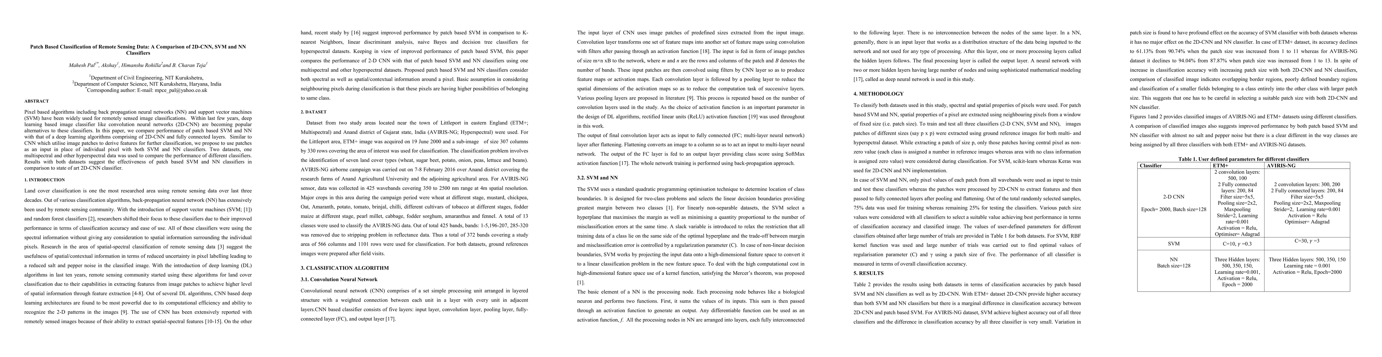 This paper compares the performance of patch-based SVM and NN classifiers against 2D-CNN for remote sensing data classification using multispectral and hyperspectral datasets. Results indicate that patch-based SVM and NN classifiers outperform the state-of-the-art 2D-CNN classifier.