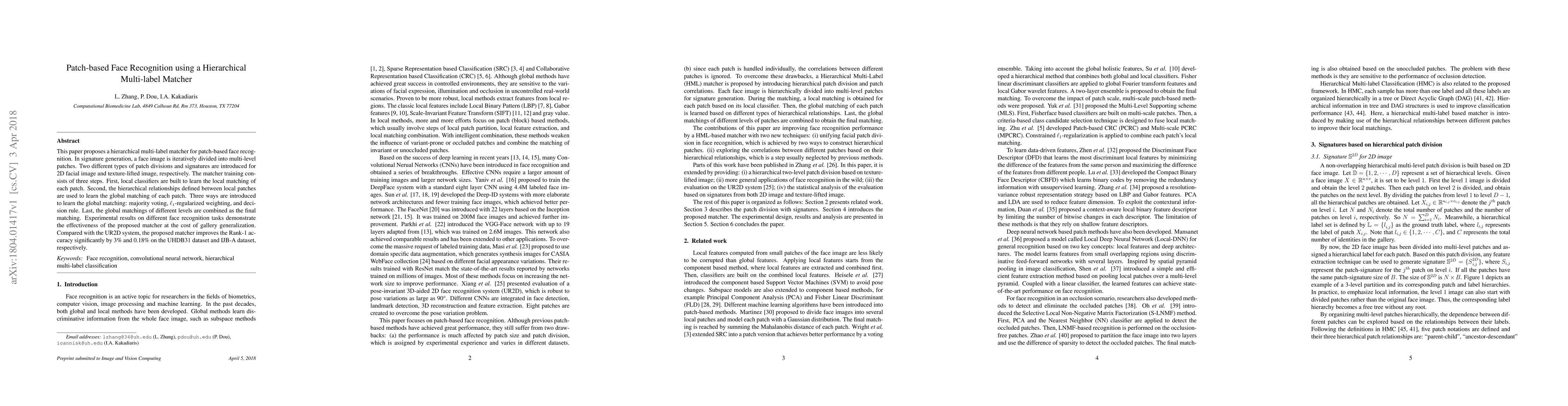 This paper proposes a hierarchical multi-label matcher for patch-based face recognition, improving Rank-1 accuracy by 3% on UHDB31 and 0.18% on IJB-A datasets compared to the UR2D system, through iterative patch division and multi-level matching strategies.