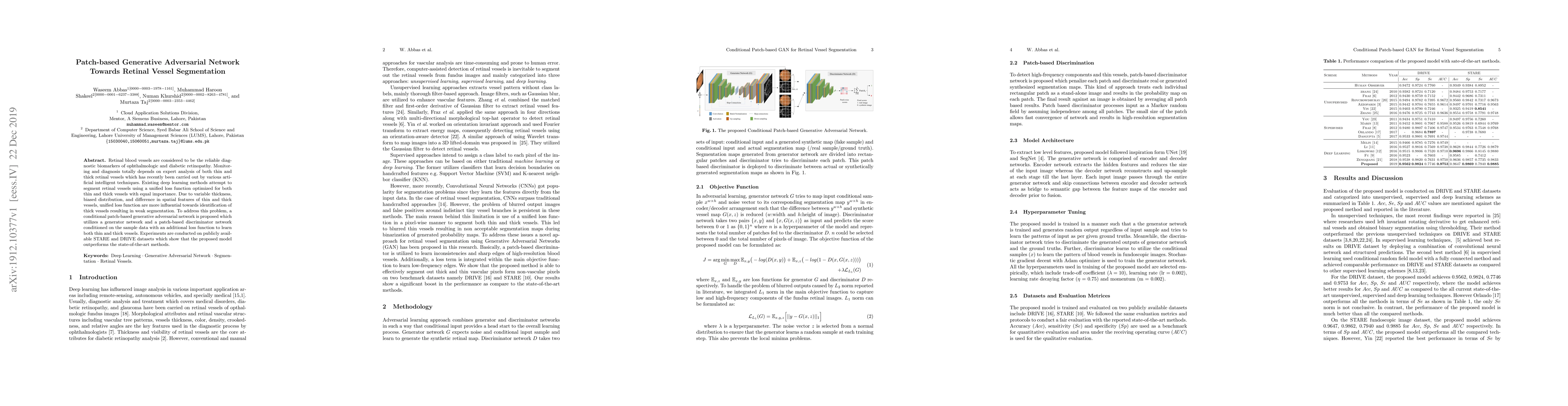 This paper proposes a conditional patch-based generative adversarial network for segmenting retinal vessels, addressing the issue of uneven segmentation due to varying vessel thicknesses. The model outperforms existing methods on STARE and DRIVE datasets.