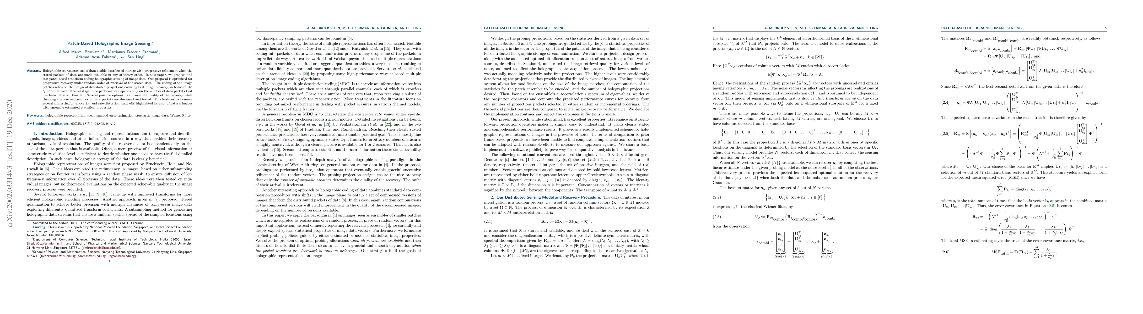 This paper proposes a patch-based method for holographic image sensing that enables progressive recovery of images with random retrieval order, optimizing $orall_2$ norm image quality based on retrieved data packets.