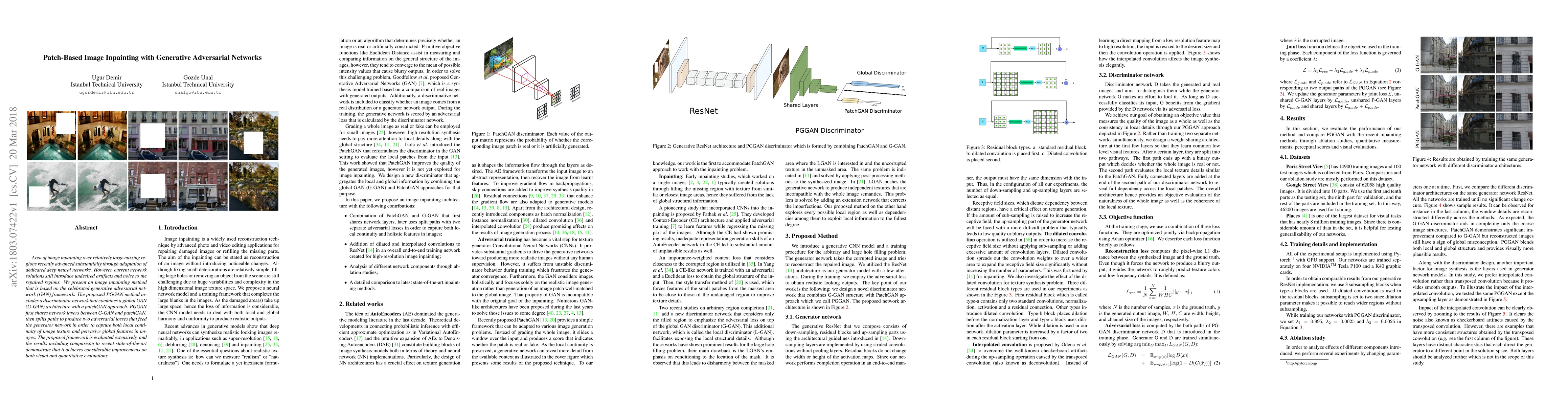 This paper introduces a patch-based image inpainting method using a generative adversarial network (GAN) framework, specifically a PGGAN method that combines a global GAN architecture with a patchGAN approach. The proposed method achieves significant improvements in both visual quality and quantitative metrics over recent state-of-the-art techniques by capturing both local texture continuity and global image features.