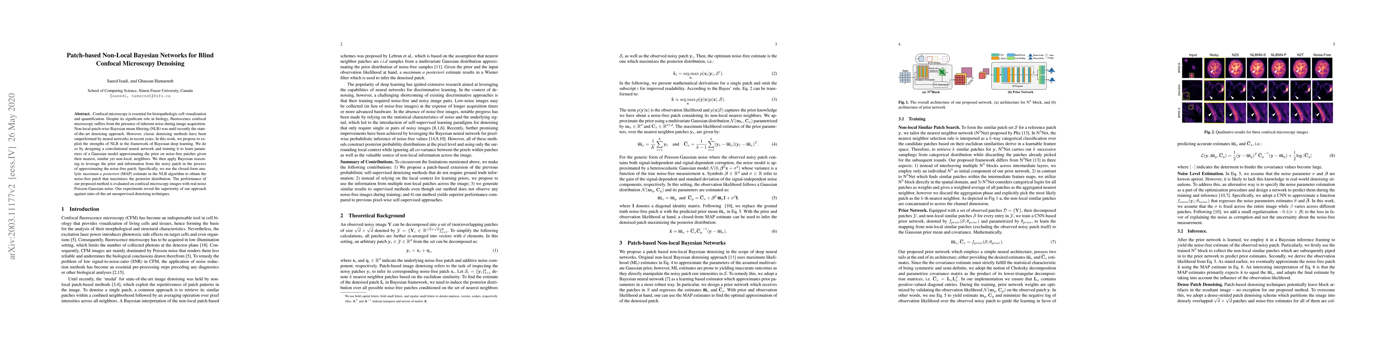 This paper proposes a patch-based non-local Bayesian network within a convolutional neural network framework to denoise confocal microscopy images. The method leverages Bayesian deep learning to approximate noise-free patches using non-local patch similarities, outperforming existing state-of-the-art denoising techniques.