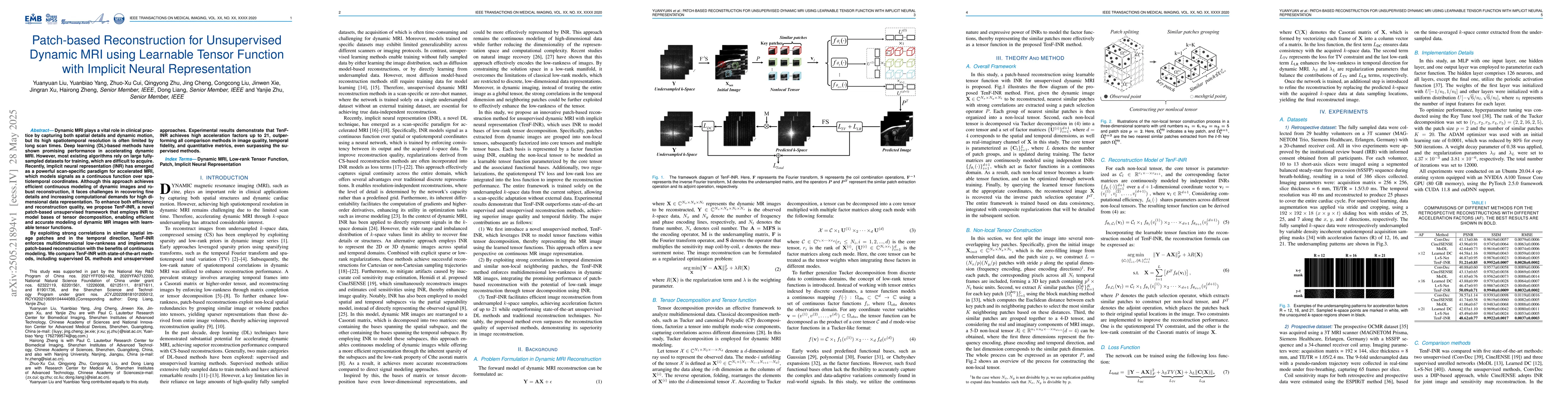 TenF-INR introduces a novel patch-based unsupervised framework that employs INR for learnable tensor functions, enabling efficient modeling of dynamic MR images.