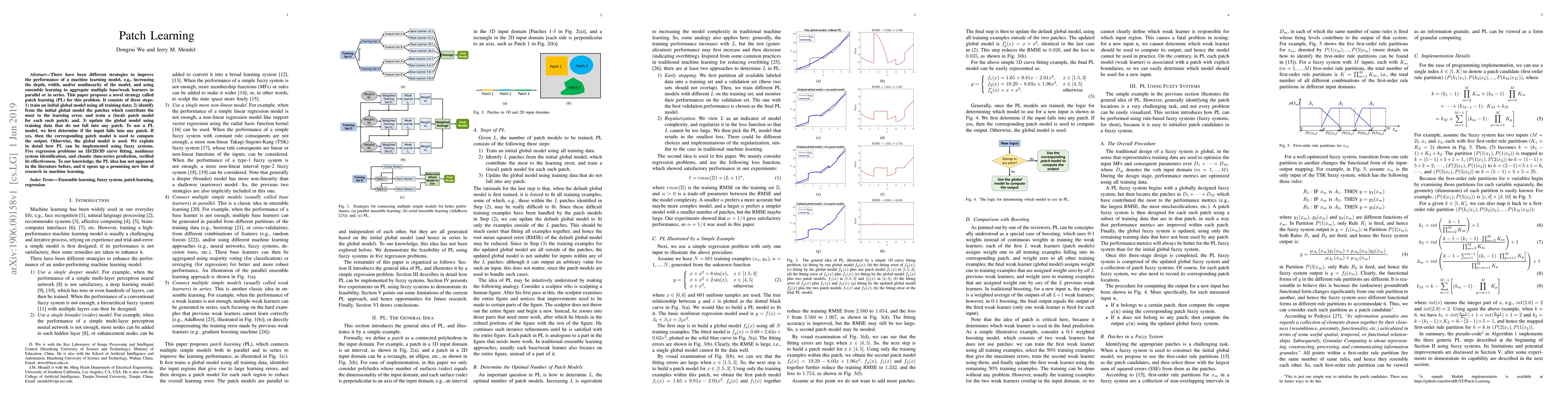There have been different strategies to improve the performance of a machine learning model, e.g., increasing the depth, width, and/or nonlinearity of the model, and using ensemble learning to aggregate multiple base/weak learners in parallel or in series. This paper proposes a novel strategy called patch learning (PL) for this problem. It consists of three steps: 1) train an initial global model using all training data; 2) identify from the initial global model the patches which contribute the most to the learning error, and train a (local) patch model for each such patch; and, 3) update the global model using training data that do not fall into any patch. To use a PL model, we first determine if the input falls into any patch. If yes, then the corresponding patch model is used to compute the output. Otherwise, the global model is used. We explain in detail how PL can be implemented using fuzzy systems. Five regression problems on 1D/2D/3D curve fitting, nonlinear system identification, and chaotic time-series prediction, verified its effectiveness. To our knowledge, the PL idea has not appeared in the literature before, and it opens up a promising new line of research in machine learning.