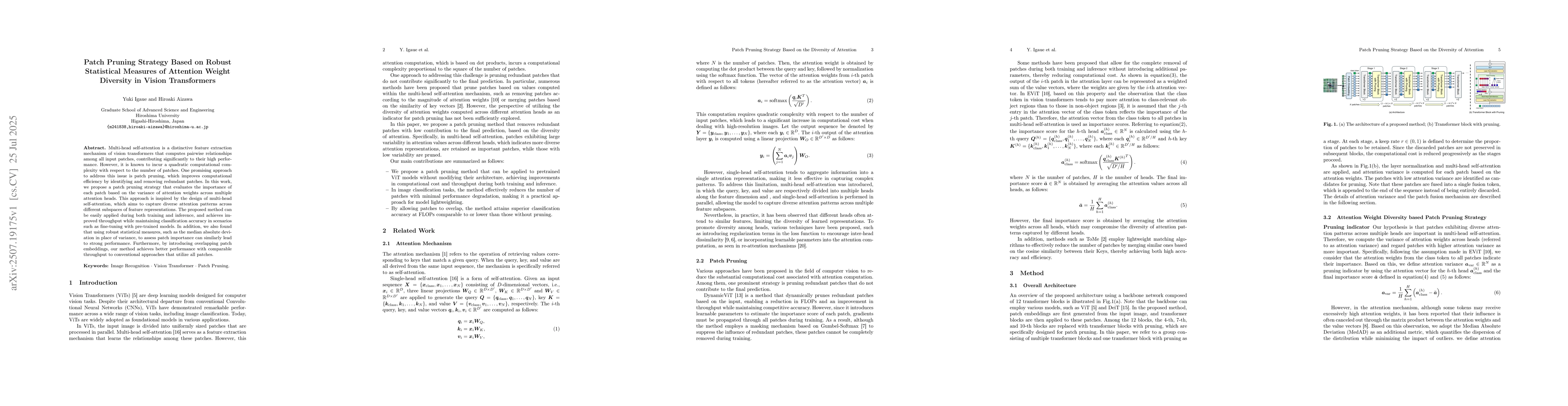 Multi-head self-attention is a distinctive feature extraction mechanism of vision transformers that computes pairwise relationships among all input patches, contributing significantly to their high performance. However, it is known to incur a quadratic computational complexity with respect to the number of patches. One promising approach to address this issue is patch pruning, which improves computational efficiency by identifying and removing redundant patches. In this work, we propose a patch pruning strategy that evaluates the importance of each patch based on the variance of attention weights across multiple attention heads. This approach is inspired by the design of multi-head self-attention, which aims to capture diverse attention patterns across different subspaces of feature representations. The proposed method can be easily applied during both training and inference, and achieves improved throughput while maintaining classification accuracy in scenarios such as fine-tuning with pre-trained models. In addition, we also found that using robust statistical measures, such as the median absolute deviation in place of variance, to assess patch importance can similarly lead to strong performance. Furthermore, by introducing overlapping patch embeddings, our method achieves better performance with comparable throughput to conventional approaches that utilize all patches.