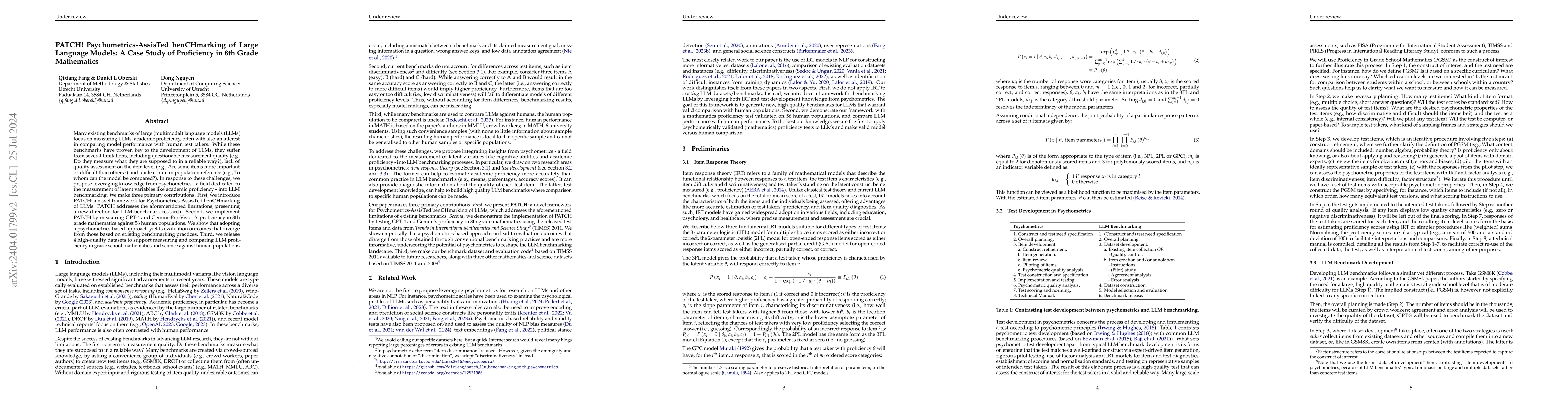 The paper introduces PATCH, a framework for Psychometrics-AssisTed benCHmarking of large language models (LLMs) to address existing benchmark limitations. PATCH evaluates LLMs like GPT-4 and Gemini-Pro-Vision against human populations, revealing divergent evaluation outcomes compared to traditional methods, and releases datasets for further research.