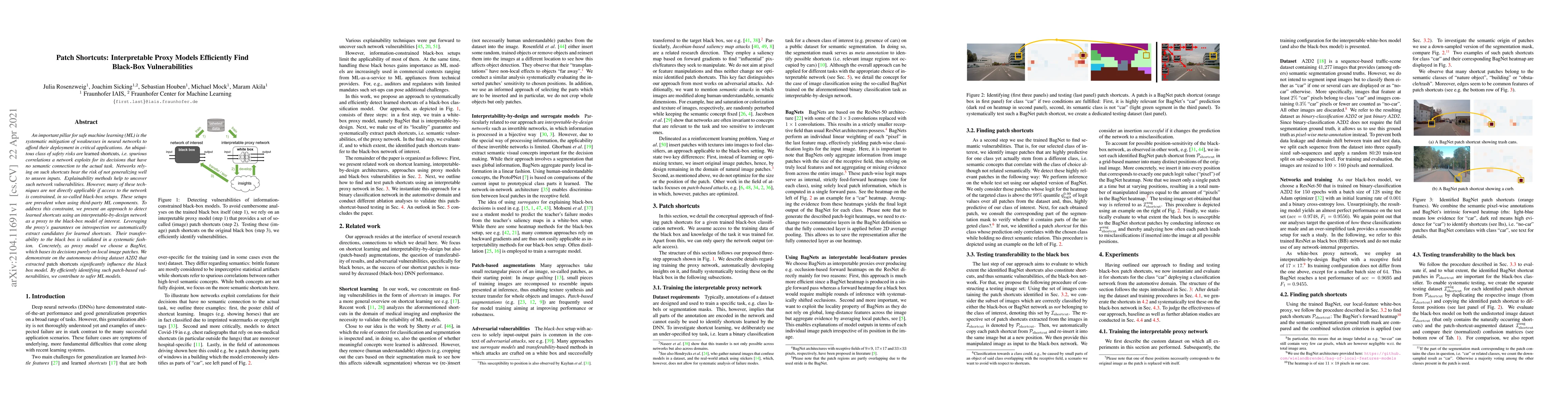 An important pillar for safe machine learning (ML) is the systematic mitigation of weaknesses in neural networks to afford their deployment in critical applications. An ubiquitous class of safety risks are learned shortcuts, i.e. spurious correlations a network exploits for its decisions that have no semantic connection to the actual task. Networks relying on such shortcuts bear the risk of not generalizing well to unseen inputs. Explainability methods help to uncover such network vulnerabilities. However, many of these techniques are not directly applicable if access to the network is constrained, in so-called black-box setups. These setups are prevalent when using third-party ML components. To address this constraint, we present an approach to detect learned shortcuts using an interpretable-by-design network as a proxy to the black-box model of interest. Leveraging the proxy's guarantees on introspection we automatically extract candidates for learned shortcuts. Their transferability to the black box is validated in a systematic fashion. Concretely, as proxy model we choose a BagNet, which bases its decisions purely on local image patches. We demonstrate on the autonomous driving dataset A2D2 that extracted patch shortcuts significantly influence the black box model. By efficiently identifying such patch-based vulnerabilities, we contribute to safer ML models.