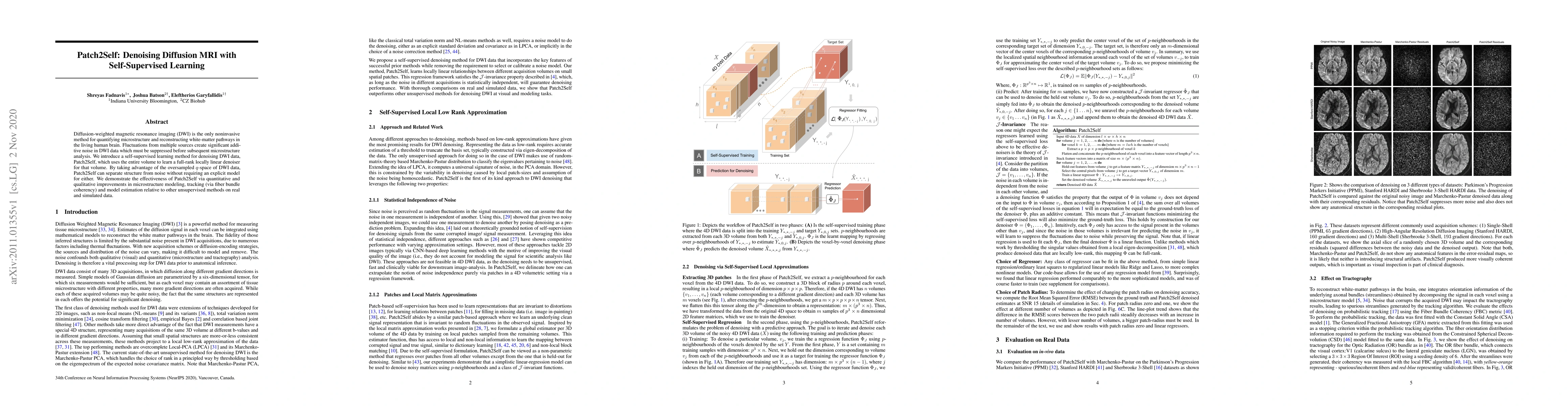 Patch2Self employs self-supervised learning to denoise diffusion-weighted MRI data, enhancing microstructure analysis and white-matter pathway reconstruction. It leverages the entire DWI volume to learn a locally linear denoiser, improving microstructure modeling and fiber bundle tracking without explicit noise or structure models.
