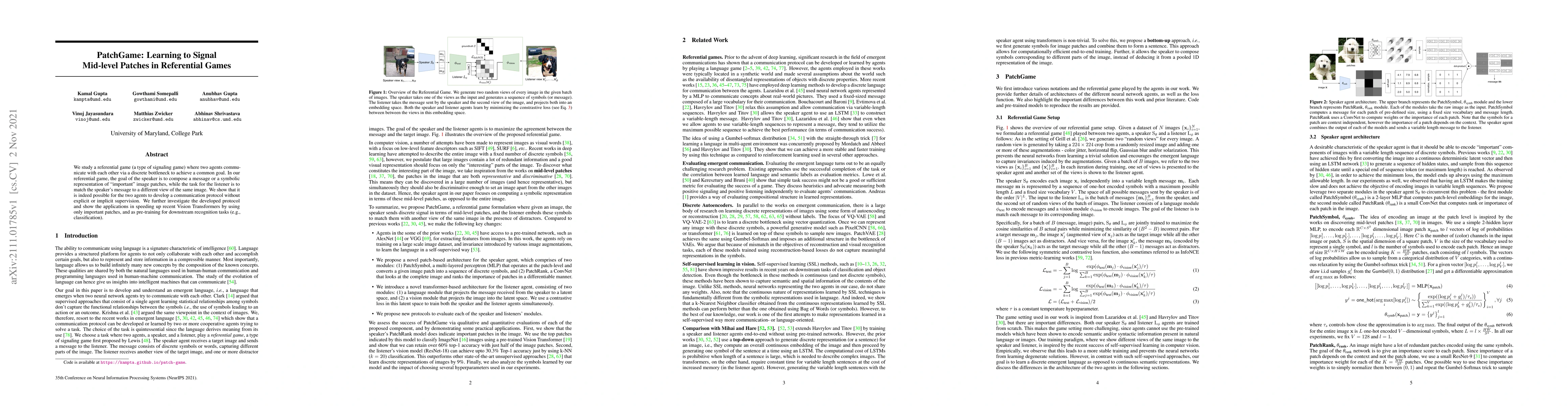 We study a referential game (a type of signaling game) where two agents communicate with each other via a discrete bottleneck to achieve a common goal. In our referential game, the goal of the speaker is to compose a message or a symbolic representation of "important" image patches, while the task for the listener is to match the speaker's message to a different view of the same image. We show that it is indeed possible for the two agents to develop a communication protocol without explicit or implicit supervision. We further investigate the developed protocol and show the applications in speeding up recent Vision Transformers by using only important patches, and as pre-training for downstream recognition tasks (e.g., classification). Code available at https://github.com/kampta/PatchGame.