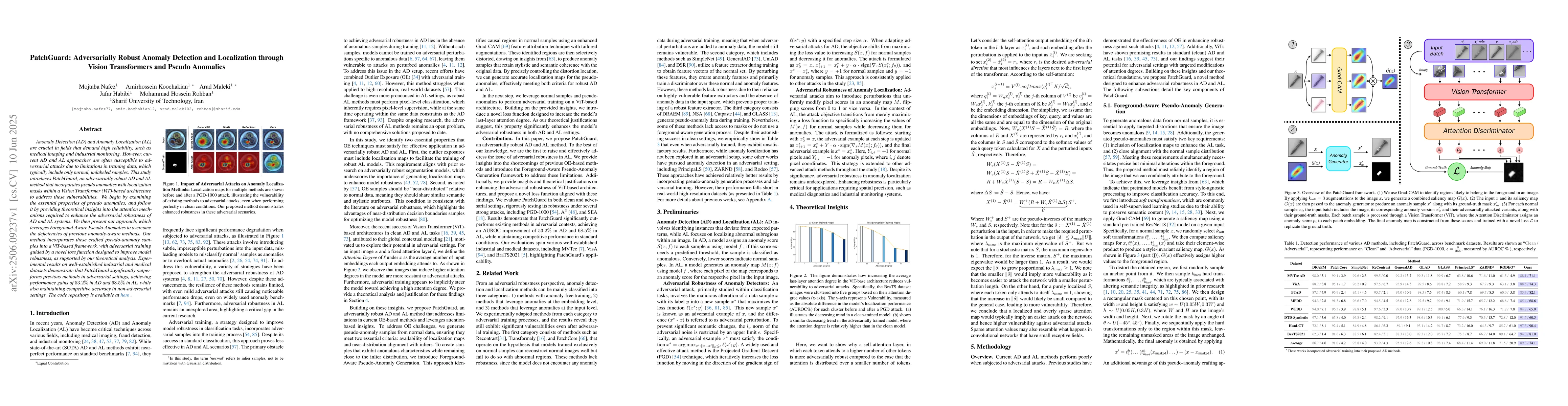 Anomaly Detection (AD) and Anomaly Localization (AL) are crucial in fields that demand high reliability, such as medical imaging and industrial monitoring. However, current AD and AL approaches are often susceptible to adversarial attacks due to limitations in training data, which typically include only normal, unlabeled samples. This study introduces PatchGuard, an adversarially robust AD and AL method that incorporates pseudo anomalies with localization masks within a Vision Transformer (ViT)-based architecture to address these vulnerabilities. We begin by examining the essential properties of pseudo anomalies, and follow it by providing theoretical insights into the attention mechanisms required to enhance the adversarial robustness of AD and AL systems. We then present our approach, which leverages Foreground-Aware Pseudo-Anomalies to overcome the deficiencies of previous anomaly-aware methods. Our method incorporates these crafted pseudo-anomaly samples into a ViT-based framework, with adversarial training guided by a novel loss function designed to improve model robustness, as supported by our theoretical analysis. Experimental results on well-established industrial and medical datasets demonstrate that PatchGuard significantly outperforms previous methods in adversarial settings, achieving performance gains of $53.2\%$ in AD and $68.5\%$ in AL, while also maintaining competitive accuracy in non-adversarial settings. The code repository is available at https://github.com/rohban-lab/PatchGuard .