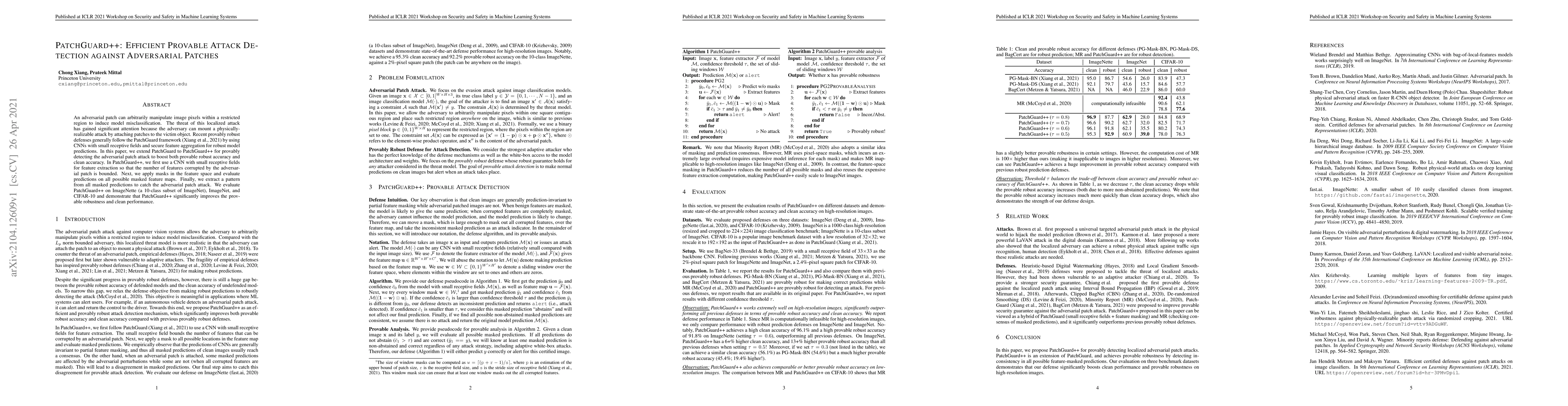 An adversarial patch can arbitrarily manipulate image pixels within a restricted region to induce model misclassification. The threat of this localized attack has gained significant attention because the adversary can mount a physically-realizable attack by attaching patches to the victim object. Recent provably robust defenses generally follow the PatchGuard framework by using CNNs with small receptive fields and secure feature aggregation for robust model predictions. In this paper, we extend PatchGuard to PatchGuard++ for provably detecting the adversarial patch attack to boost both provable robust accuracy and clean accuracy. In PatchGuard++, we first use a CNN with small receptive fields for feature extraction so that the number of features corrupted by the adversarial patch is bounded. Next, we apply masks in the feature space and evaluate predictions on all possible masked feature maps. Finally, we extract a pattern from all masked predictions to catch the adversarial patch attack. We evaluate PatchGuard++ on ImageNette (a 10-class subset of ImageNet), ImageNet, and CIFAR-10 and demonstrate that PatchGuard++ significantly improves the provable robustness and clean performance.