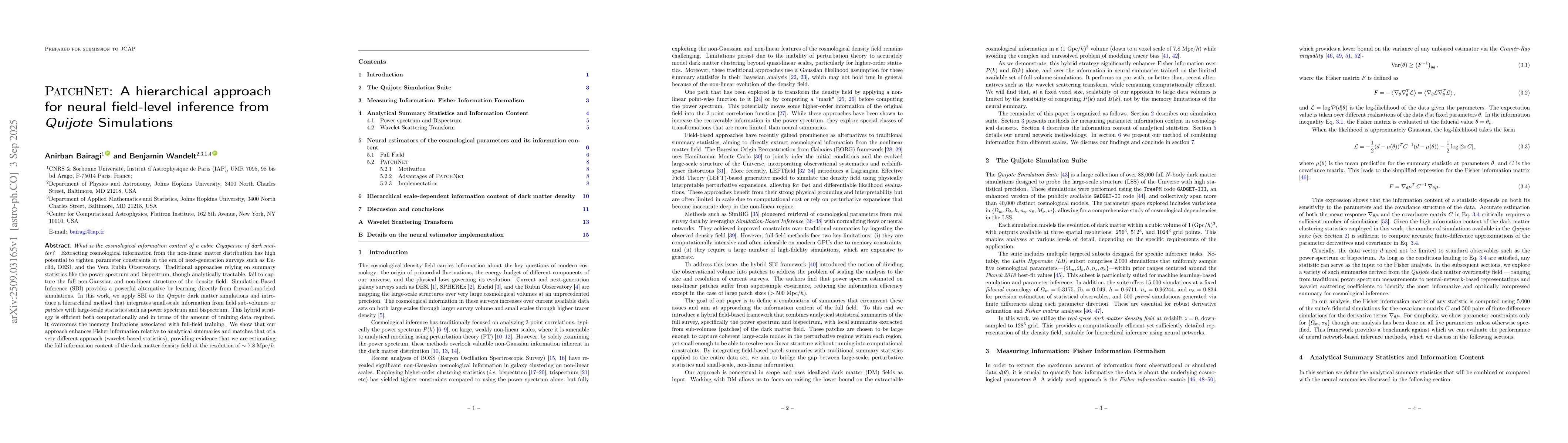 \textit{What is the cosmological information content of a cubic Gigaparsec of dark matter? } Extracting cosmological information from the non-linear matter distribution has high potential to tighten parameter constraints in the era of next-generation surveys such as Euclid, DESI, and the Vera Rubin Observatory. Traditional approaches relying on summary statistics like the power spectrum and bispectrum, though analytically tractable, fail to capture the full non-Gaussian and non-linear structure of the density field. Simulation-Based Inference (SBI) provides a powerful alternative by learning directly from forward-modeled simulations. In this work, we apply SBI to the \textit{Quijote} dark matter simulations and introduce a hierarchical method that integrates small-scale information from field sub-volumes or \textit{patches} with large-scale statistics such as power spectrum and bispectrum. This hybrid strategy is efficient both computationally and in terms of the amount of training data required. It overcomes the memory limitations associated with full-field training. We show that our approach enhances Fisher information relative to analytical summaries and matches that of a very different approach (wavelet-based statistics), providing evidence that we are estimating the full information content of the dark matter density field at the resolution of $\sim 7.8~\mathrm{Mpc}/h$.