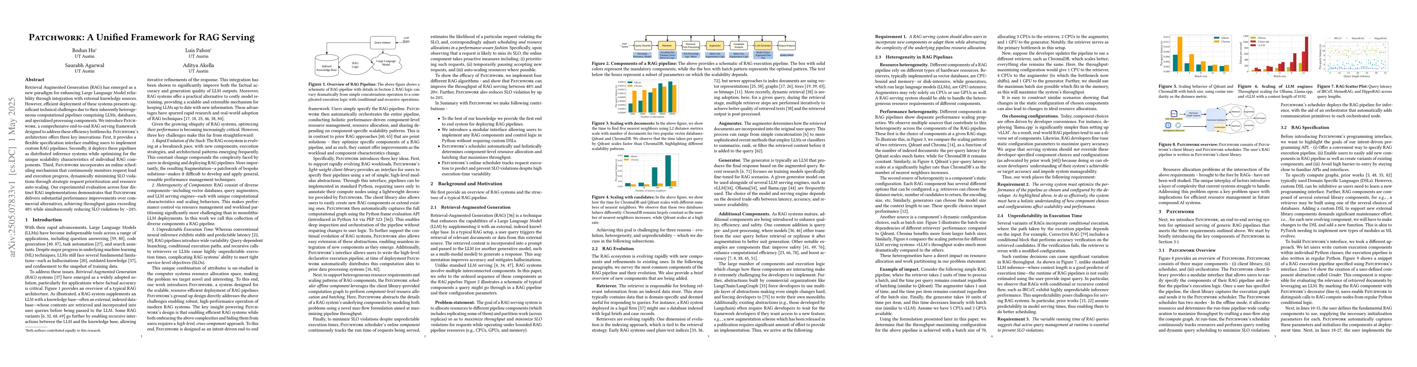 The paper introduces Patchwork, a unified framework for RAG serving, addressing technical challenges through flexible pipeline specification, distributed inference, and online scheduling mechanisms.