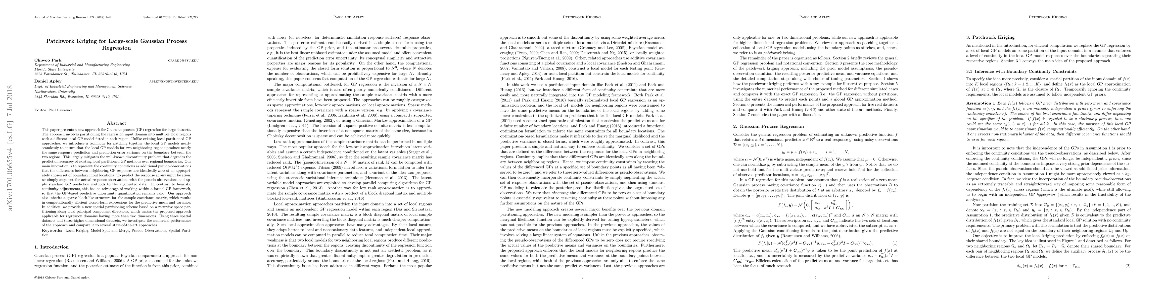 This paper proposes Patchwork Kriging, a new approach for Gaussian Process Regression on large datasets, which mitigates the discontinuity problem of local partitioned GP methods by adding pseudo-observations to ensure seamless boundary prediction.