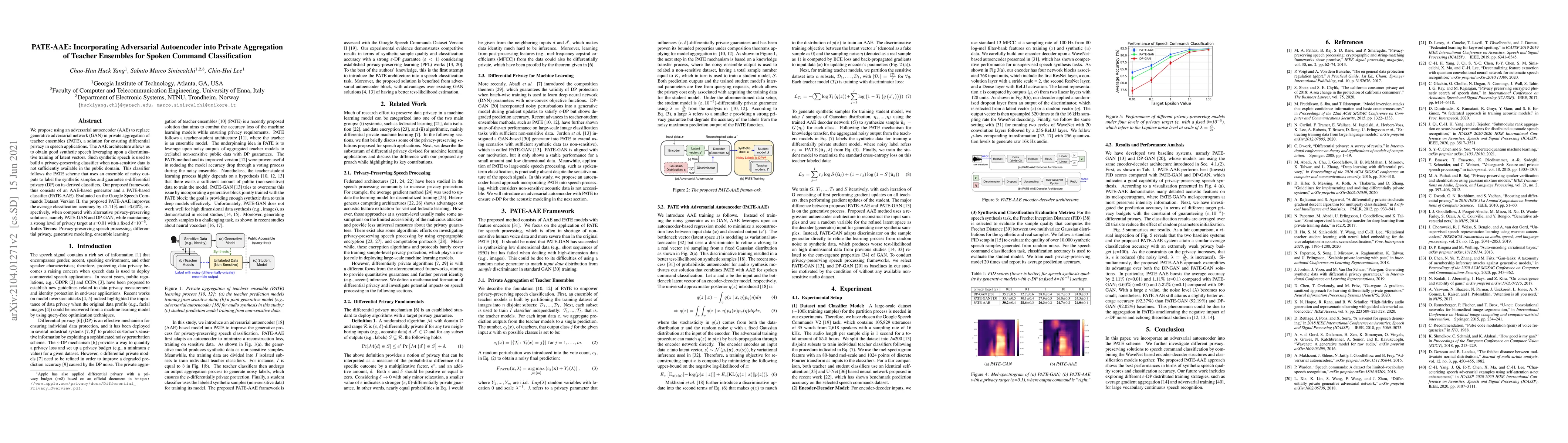 The paper proposes PATE-AAE, an approach that integrates adversarial autoencoders into private aggregation of teacher ensembles for differential privacy in speech command classification. This method improves classification accuracy by 2.11% and 6.60% over PATE-GAN and DP-GAN respectively, while maintaining strong privacy at $\varepsilon$=0.01 and $\delta$=10$^{-5}$.