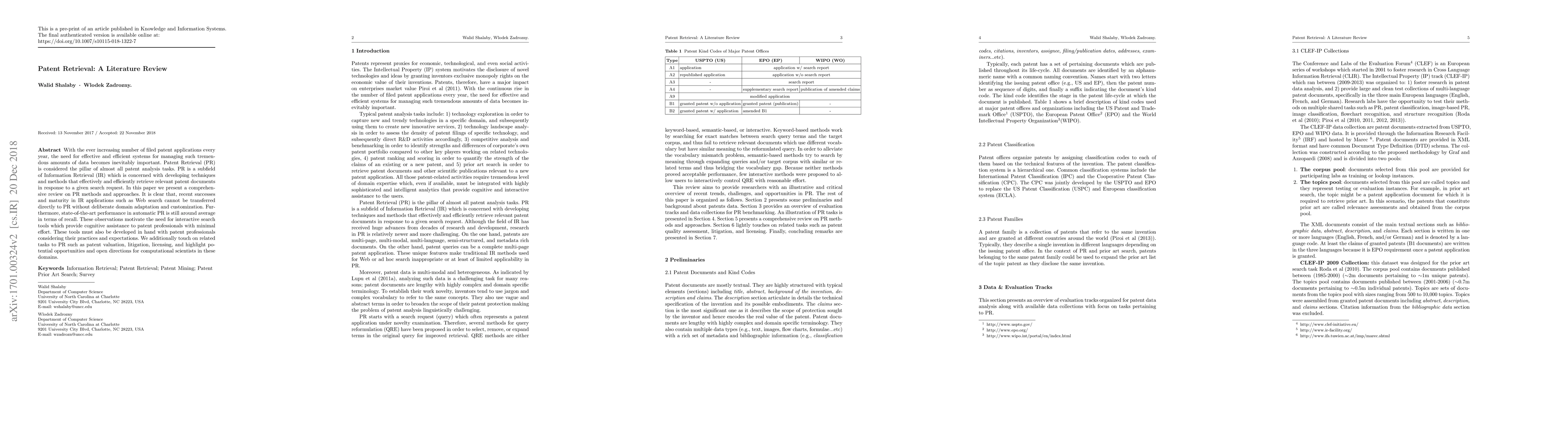 This paper reviews Patent Retrieval (PR) methods, emphasizing the need for domain-specific adaptations due to the unique challenges of patent data compared to general information retrieval. It highlights the importance of interactive search tools to assist patent professionals and discusses related tasks like valuation and litigation.