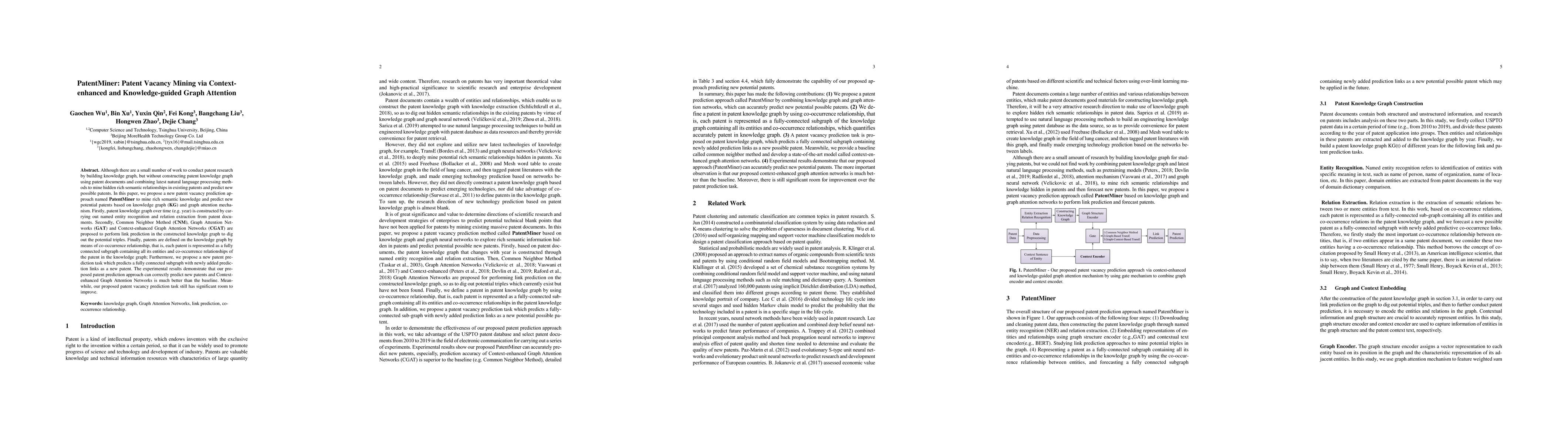 PatentMiner constructs a patent knowledge graph from documents using named entity recognition and relation extraction, then employs Graph Attention Networks and Context-enhanced Graph Attention Networks for vacancy prediction. Experimental results show improved patent prediction over baselines, though the method still has room for enhancement.