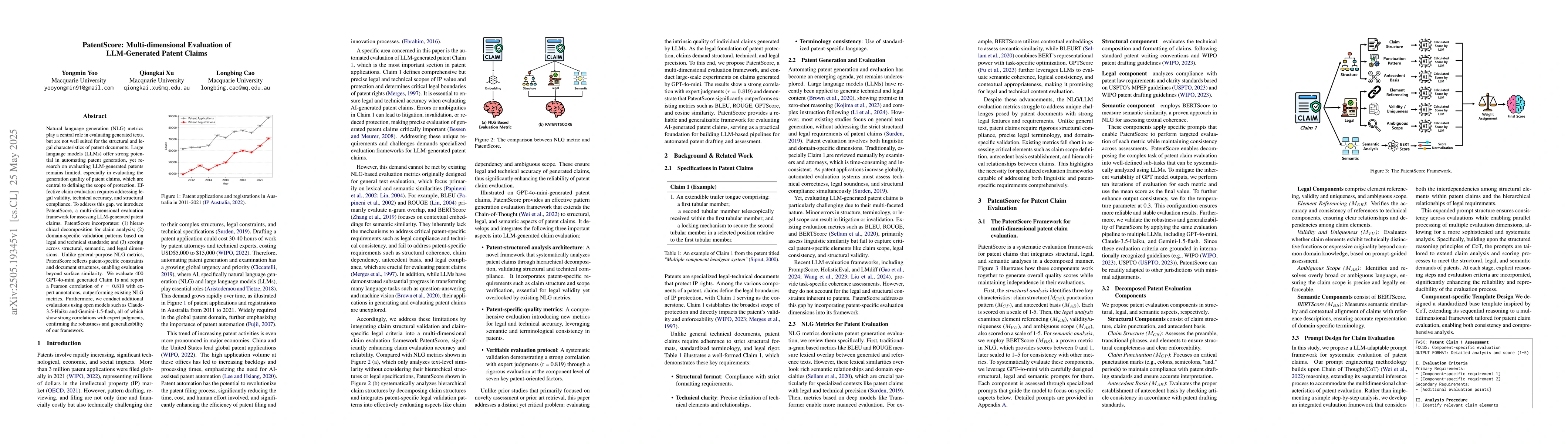 This research is important as it addresses the gap in evaluating LLM-generated patents, particularly the generation quality of patent claims, which are crucial for defining the scope of protection. Effective claim evaluation requires addressing legal validity, technical accuracy, and structural compliance, which PatentScore accomplishes.