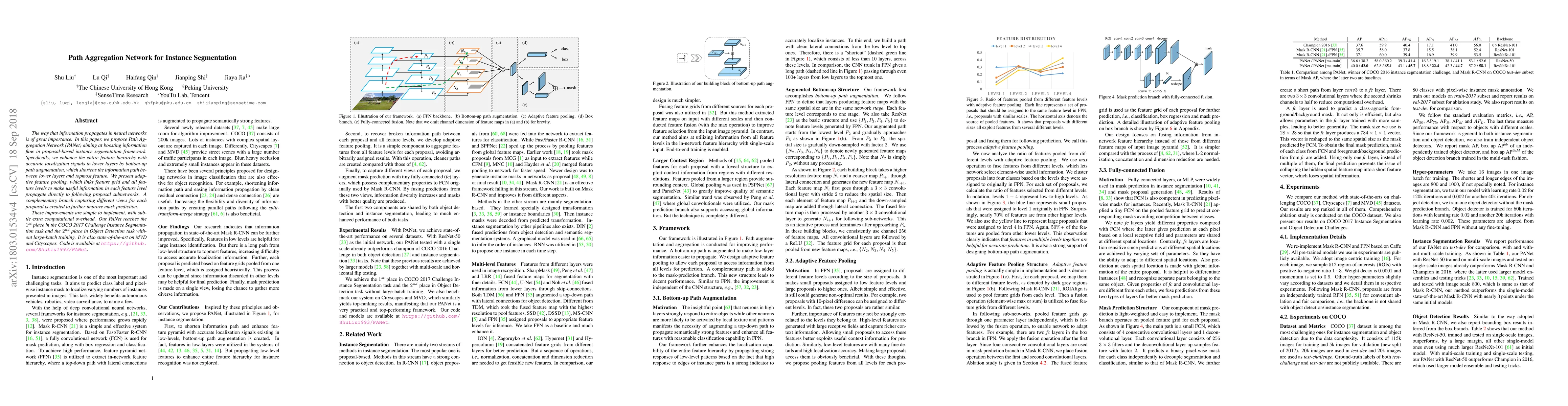 The Path Aggregation Network (PANet) improves instance segmentation by enhancing feature flow between layers and adding complementary views for each proposal, achieving state-of-the-art results on several benchmarks.