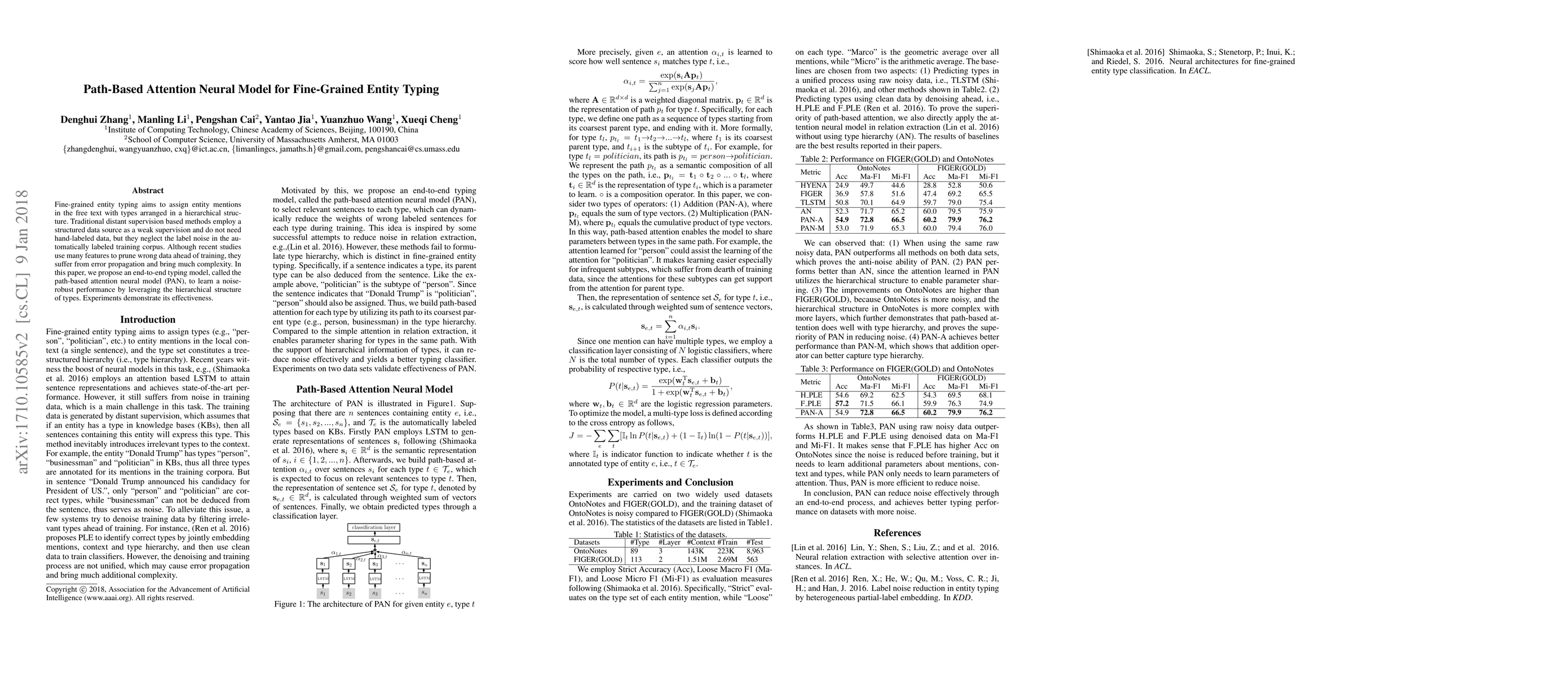 This paper introduces the path-based attention neural model (PAN) for fine-grained entity typing, aiming to improve accuracy by leveraging hierarchical type structures and reducing noise in training data. Experimental results show the PAN model's effectiveness in achieving robust performance.