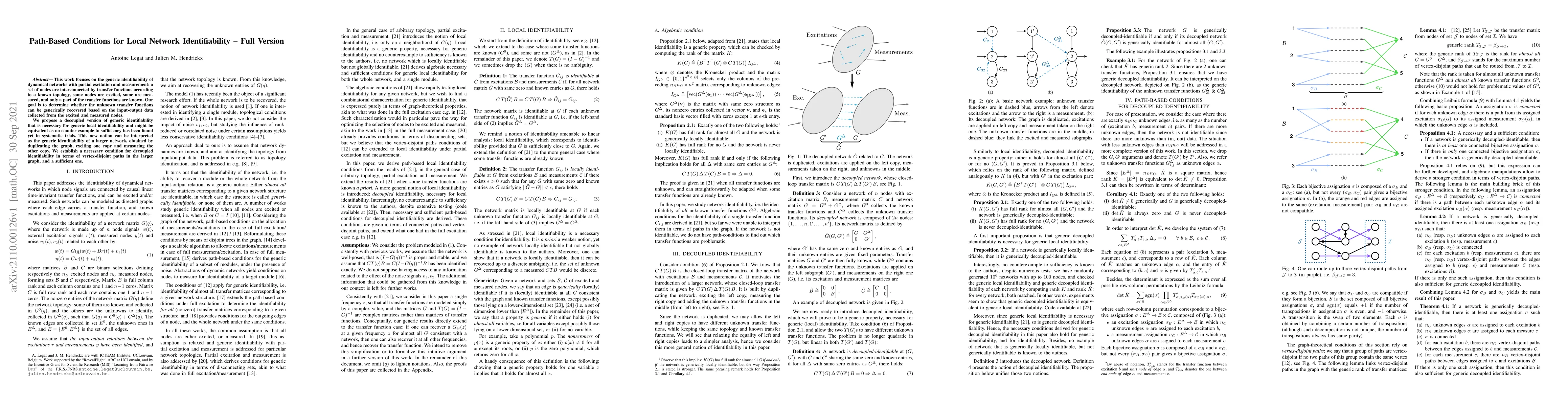 This work focuses on the generic identifiability of dynamical networks with partial excitation and measurement: a set of nodes are interconnected by transfer functions according to a known topology, some nodes are excited, some are measured, and only a part of the transfer functions are known. Our goal is to determine whether the unknown transfer functions can be generically recovered based on the input-output data collected from the excited and measured nodes. We propose a decoupled version of generic identifiability that is necessary for generic local identifiability and might be equivalent as no counter-example to sufficiency has been found yet in systematic trials. This new notion can be interpreted as the generic identifiability of a larger network, obtained by duplicating the graph, exciting one copy and measuring the other copy. We establish a necessary condition for decoupled identifiability in terms of vertex-disjoint paths in the larger graph, and a sufficient one.