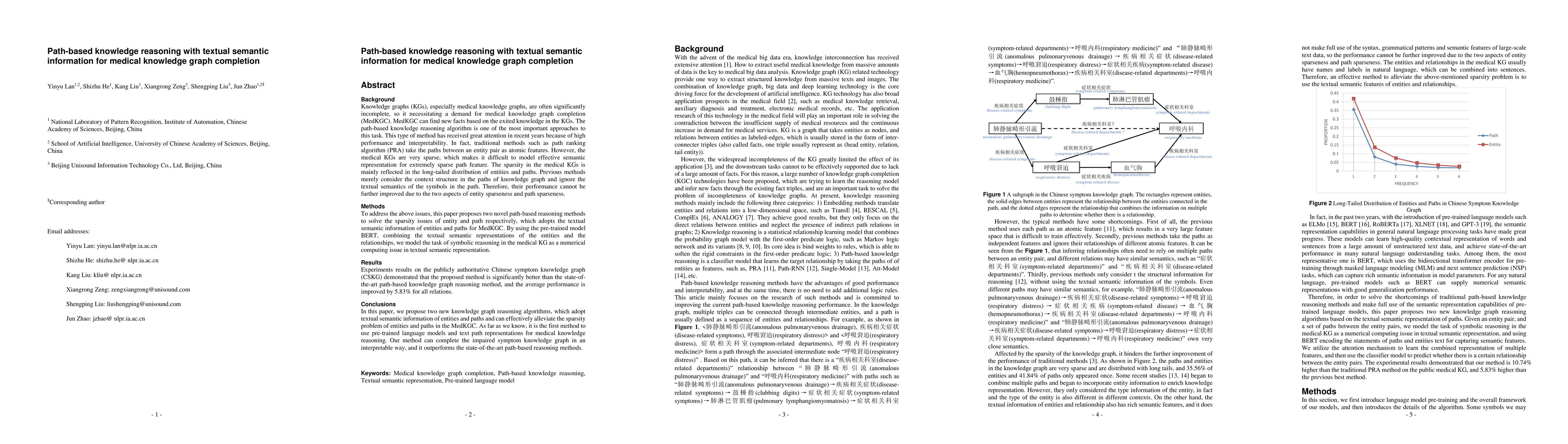 Background Knowledge graphs (KGs), especially medical knowledge graphs, are often significantly incomplete, so it necessitating a demand for medical knowledge graph completion (MedKGC). MedKGC can find new facts based on the exited knowledge in the KGs. The path-based knowledge reasoning algorithm is one of the most important approaches to this task. This type of method has received great attention in recent years because of its high performance and interpretability. In fact, traditional methods such as path ranking algorithm (PRA) take the paths between an entity pair as atomic features. However, the medical KGs are very sparse, which makes it difficult to model effective semantic representation for extremely sparse path features. The sparsity in the medical KGs is mainly reflected in the long-tailed distribution of entities and paths. Previous methods merely consider the context structure in the paths of the knowledge graph and ignore the textual semantics of the symbols in the path. Therefore, their performance cannot be further improved due to the two aspects of entity sparseness and path sparseness. To address the above issues, this paper proposes two novel path-based reasoning methods to solve the sparsity issues of entity and path respectively, which adopts the textual semantic information of entities and paths for MedKGC. By using the pre-trained model BERT, combining the textual semantic representations of the entities and the relationships, we model the task of symbolic reasoning in the medical KG as a numerical computing issue in textual semantic representation.