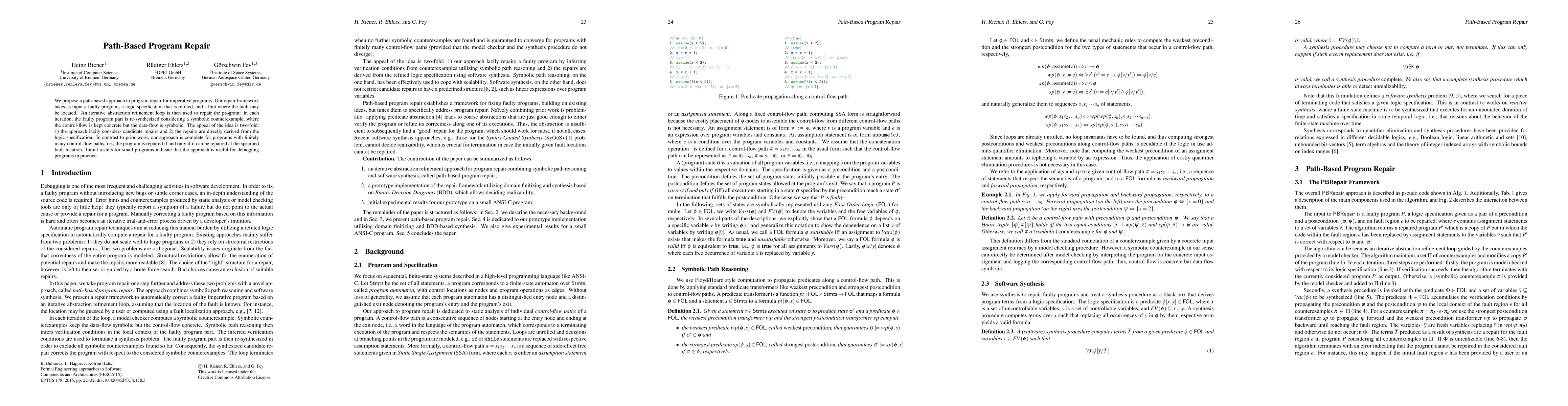 This paper introduces a path-based program repair framework that iteratively refines faulty imperative programs using an abstraction refinement loop. The approach is complete for programs with finite control-flow paths and derives repairs directly from logic specifications, providing a useful debugging tool for small programs.