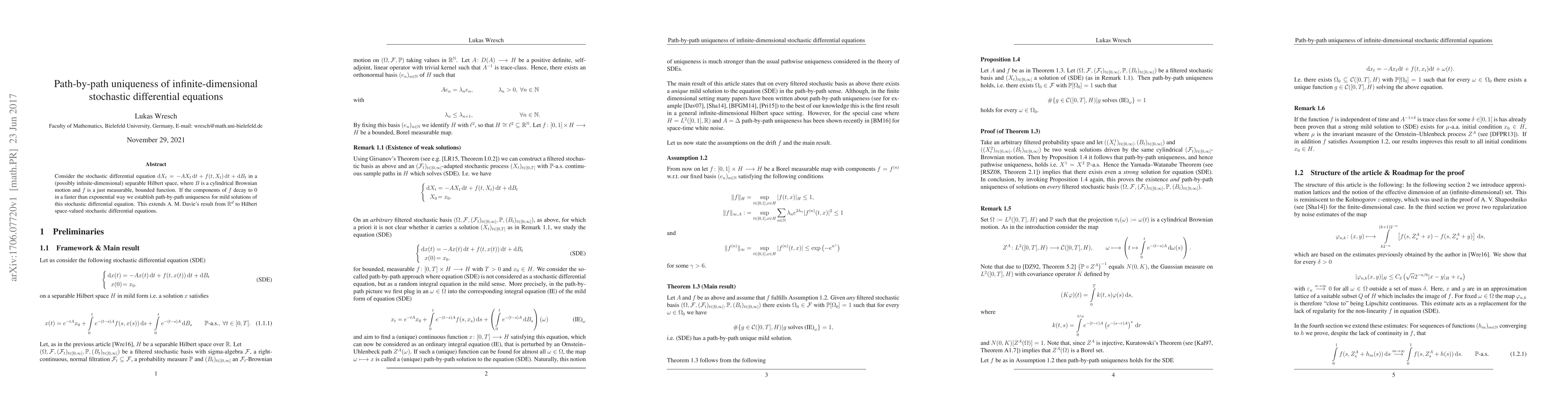 This paper establishes path-by-path uniqueness for mild solutions of infinite-dimensional stochastic differential equations driven by cylindrical Brownian motion, extending a result from finite-dimensional to infinite-dimensional Hilbert spaces under the condition that the function's components decay faster than exponentially.